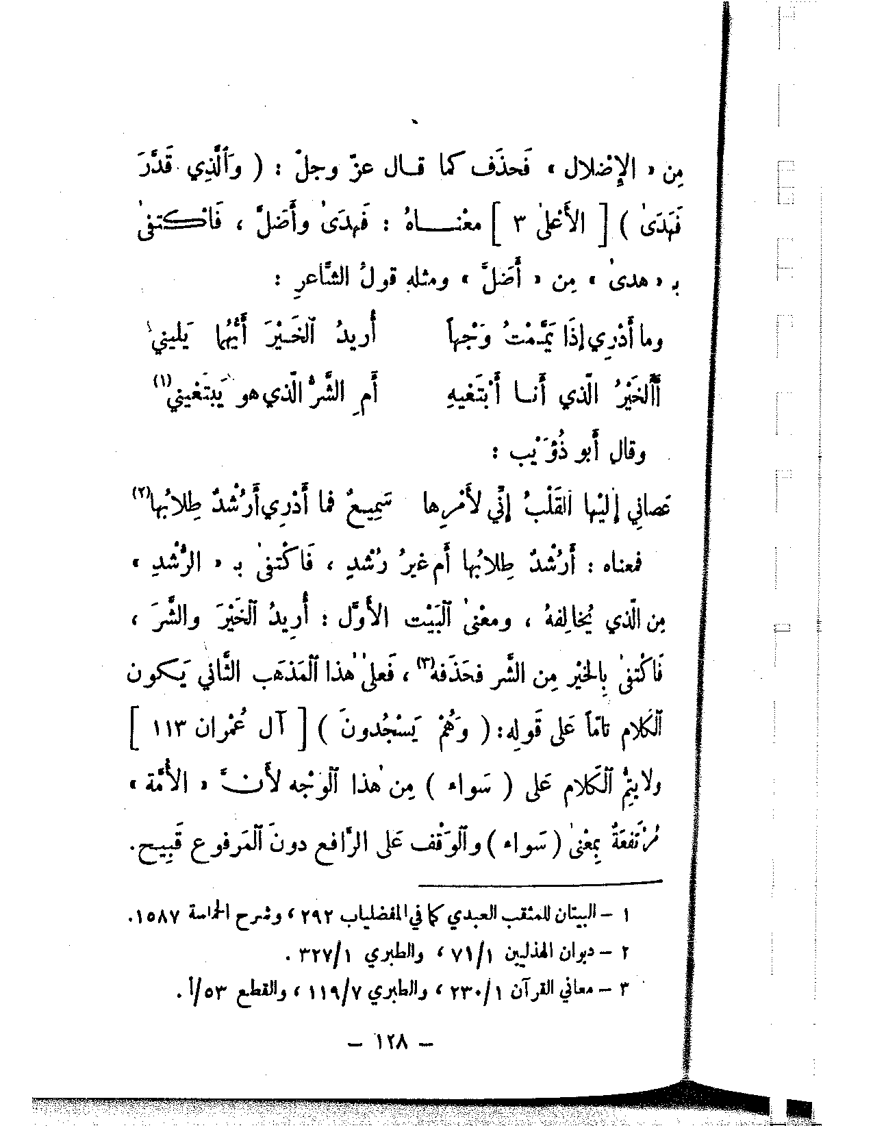 فمعناه: أرشد طلابها أم غير رشد، فاكتفى بـ «الرشد» من الذي يخالفه، ومعنى البيت الأول: أريد الخير والشر، فاكتفى بالخير من الشر فحفه، فعلى هذا المذهب الثاني يكون الكلام تامًا على قوله: {وهم يسجدون} [آل عمران: 113] ولا يتم الكلام على سواء من هذا الوجه لأن الأمة مرتفعة بمعنى (سواء) والوقف على الرافع دون المرفوع قبيح.