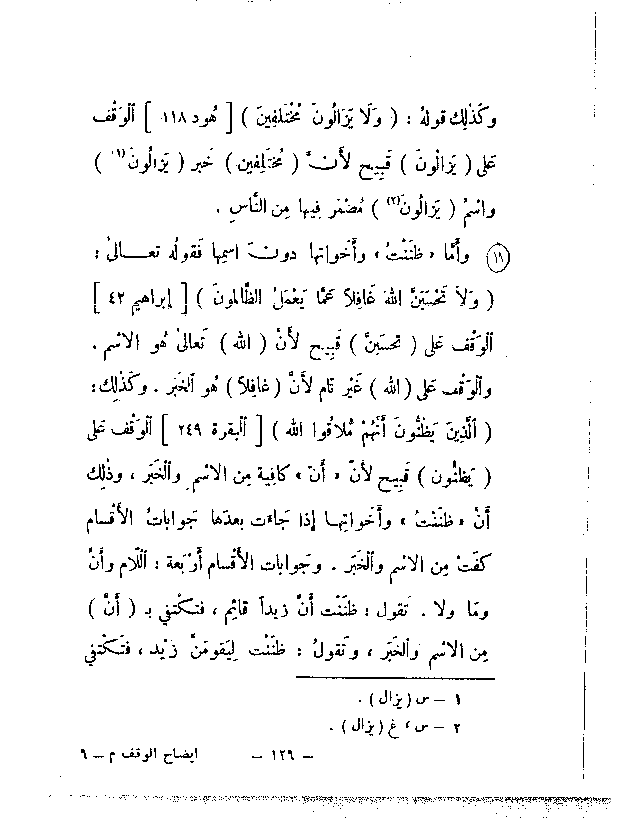 وكذلك قوله: {ولا يزالون مختلفين} [هود: 118] الوقف على يزالون قبيح لأن مختلفين خبر يزالون واسم يزالون مضمر فيها من الناس.