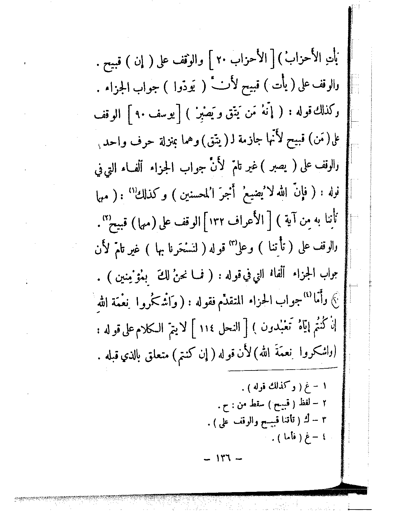 يأت الأحزاب} [الأحزاب: 20] والوقف على (إن) قبيح. والوقف على (يأت) قبيح لأن (يودوا) جواب الجزاء. وكذلك قوله: {إنه من يتق ويصبر} [يوسف: 90] الوقف على (من) قبيح لأنها جازمة لـ (يتق) وهما بمنزلة حرف واحد والوقف على (يصبر) غير تام لأن جواب الجزاء الفاء التي في قوله: {فإن الله لا يضيع أجر المحسنين} وكذلك: {مهما تأتنا به من آية} [الأعراف: 132] الوقف على (مهما) قبيح. والوقف على (تأتنا) وعلى قوله (لتسحرنا بها) غير تام لأن جواب الجزاء الفاء التي في قوله: (فما نحن لك بمؤمنين).