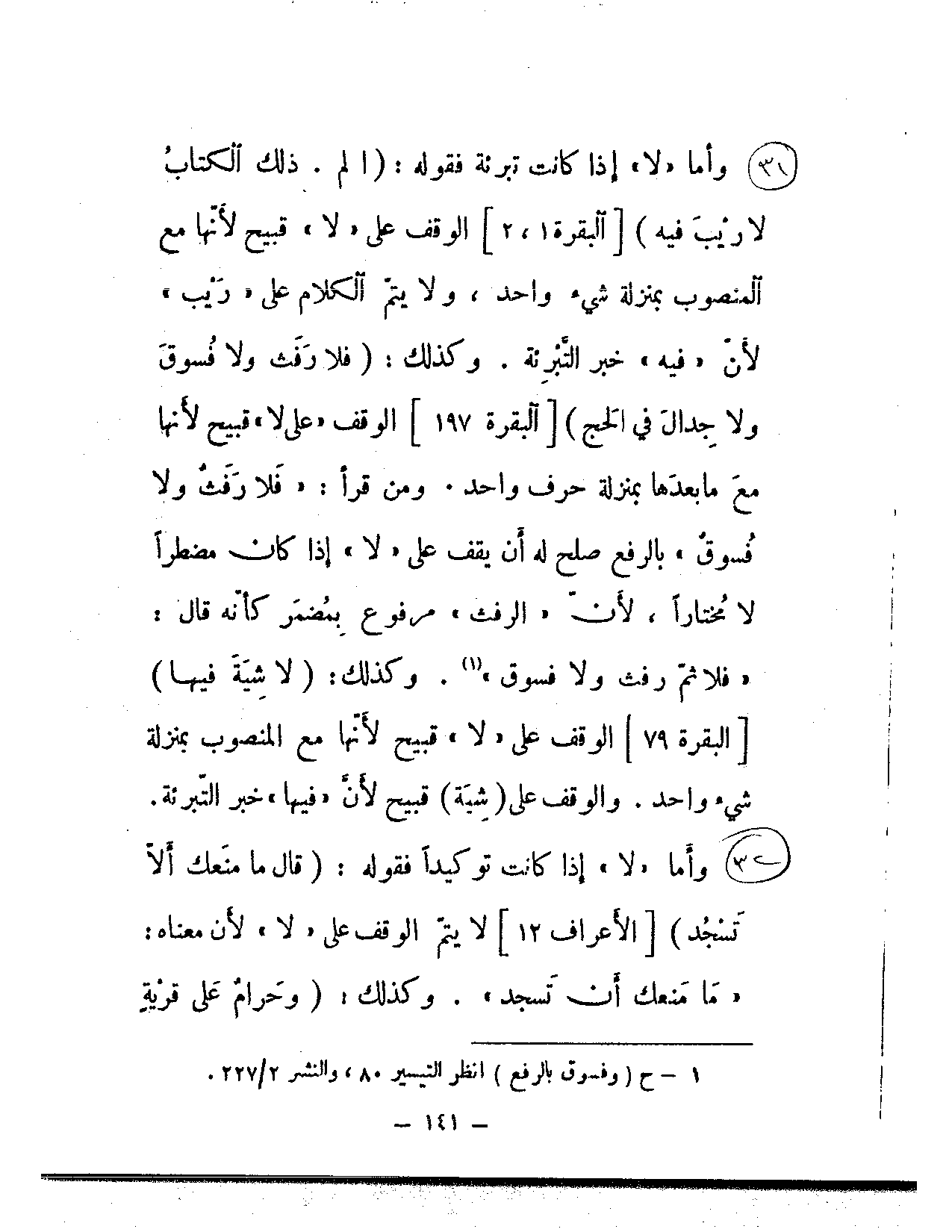 وأما «لا» إذا كانت تبرئة فقوله: {الم. ذلك الكتاب لا ريب فيه} [البقرة: 1، 2] الوقف على «لا» قبيح لأنها مع المنصوب بمنزلة شيء واحد، ولا يتم الكلام على «ريب» لأن «فيه» خبر التبرئة. وكذلك: {فلا رفث ولا فسوق ولا جدال في الحج} [البقرة: 197] الوقف «على لا» قبيح لأنها مع ما بعدها بمنزلة حرف واحد. ومن قرأ: «فلا رفث ولا فسوق» بالرفع صلح له أن يقف على «لا» إذا كان مضطرًا لا مختارًا، لأن «الرفث» مرفوع بمضمر كأنه قال: «فلا ثم رفث ولا فسوق». وكذلك: {لا شية فيها} [البقرة: 79] الوقف على «لا» قبيح لأنها مع المنصوب بمنزلة شيء واحد. والوقف على (شية) قبيح لأن «فيها» خبر التبرئة.