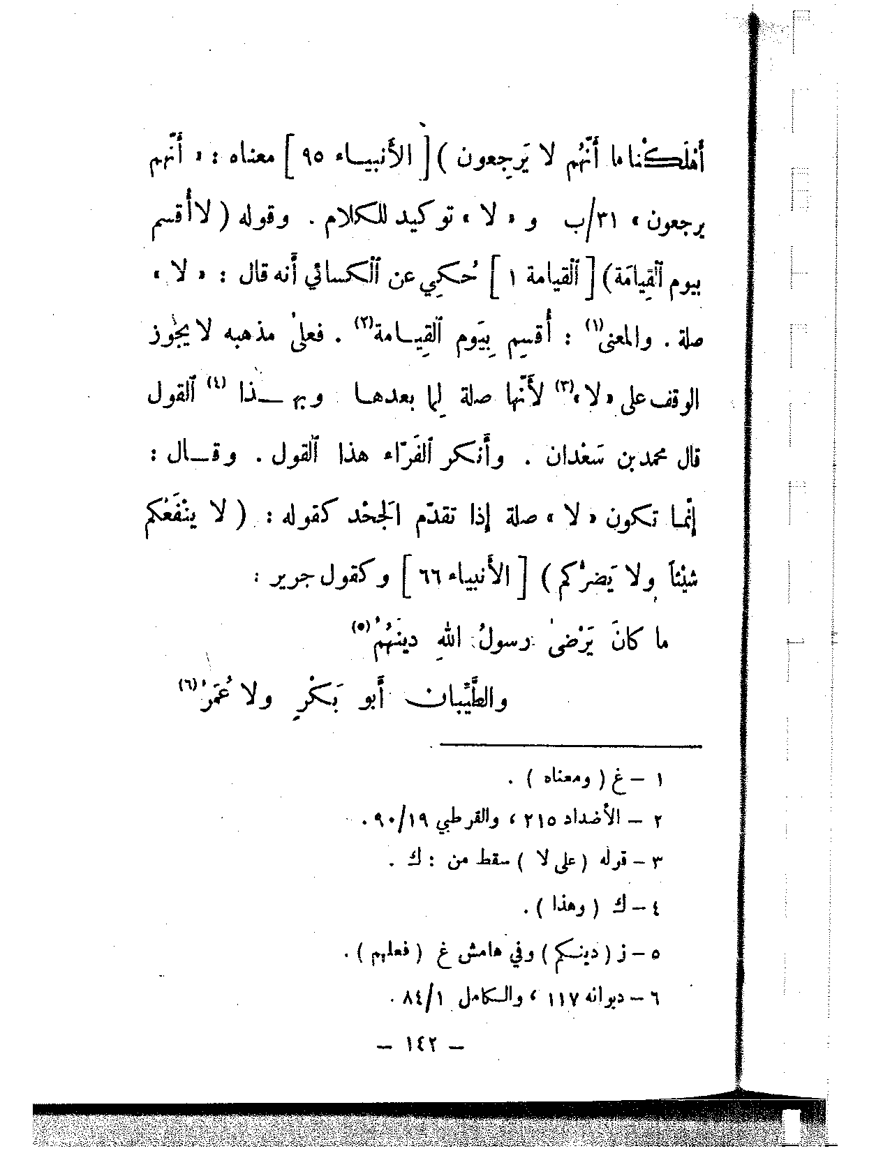 أهلكنا ما أنهم لا يرجعون} [الأنبياء: 95] معناه: «أنهم يرجعون» و «لا» توكيد للكلام. وقوله {لا أقسم بيوم القيامة} [القيامة: 1] حكي عن الكسائي أنه قال: «لا» صلة. والمعنى: أقسم بيوم القيامة. فعلى مذهبه لا يجوز الوقف على «لا» لأنها صلة لما بعدها وبهذا القول قال محمد بن سعدان. وأنكر الفراء هذا القول. وقال: إنما تكون «لا» صلة إذا تقدم الجحد كقوله: {لا ينفعكم شيئا ولا يضركم} [الأنبياء: 66] وكقول جرير: