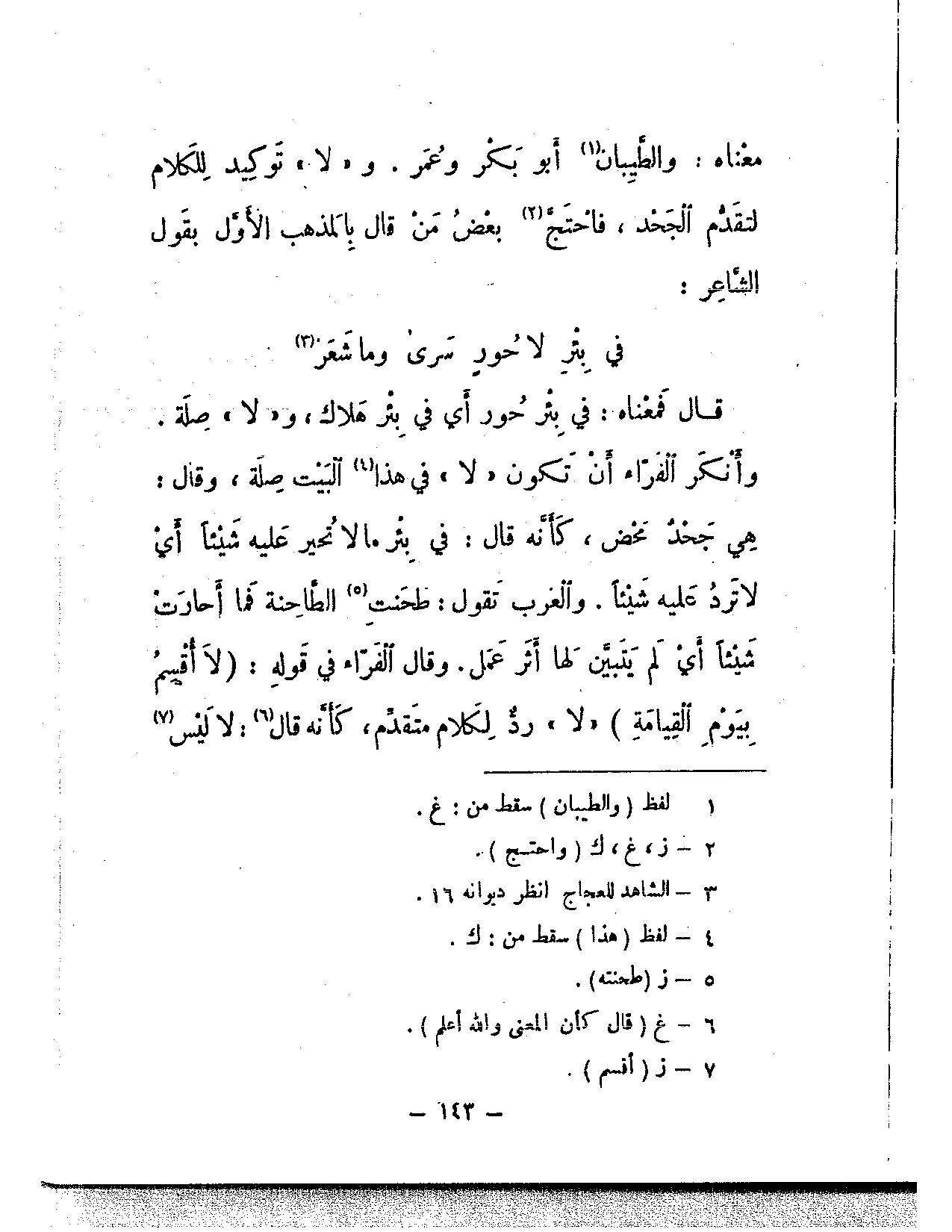 قال فمعناه: في بئر حور أي في بئر هلاك، و «لا» صلة. وأنكر الفراء أن تكون «لا» في هذا البيت صلة، وقال: هي جحد محض، كأنه قال: في بئر ما لا تحير عليه شيئًا أي لا ترد عليه شيئًا. والغرب تقول: طحنت الطاحنة فما أحارت شيئًا أي لم يتبين لها أثر عمل. وقال الفراء في قوله: {لا أقسم بيوم القيامة} «لا» رد لكلام متقدم، كأنه قال: لا ليس