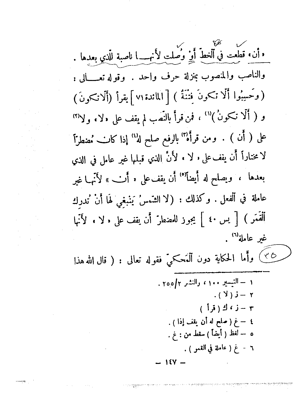 «أن» قطعت في الخط أو وصلت لأنها ناصبة للذي بعدها. والناصب والمنصوب بمنزلة حرف واحد. وقوله تعالى: {وحسبوا ألا تكون فتنة} [المائدة: 71] يقرأ (ألا تكون) و (ألا تكون)، فمن قرأ بالنصب لم يقف على «لا» ولا على (أن). ومن قرأه بالرفع صلح له إذا كان مضطرًا لا مختارًا أن يقف على «لا» لأن الذي قبلها غير عامل في الذي بعدها، ويصلح له أيضًا أن يقف على «أن» لأنها غير عاملة في الفعل. وكذلك: {لا الشمس ينبغي لها أن تدرك القمر} [يس: 40]. يجوز للمضطر أن يقف على «لا» لأنها غير عاملة.