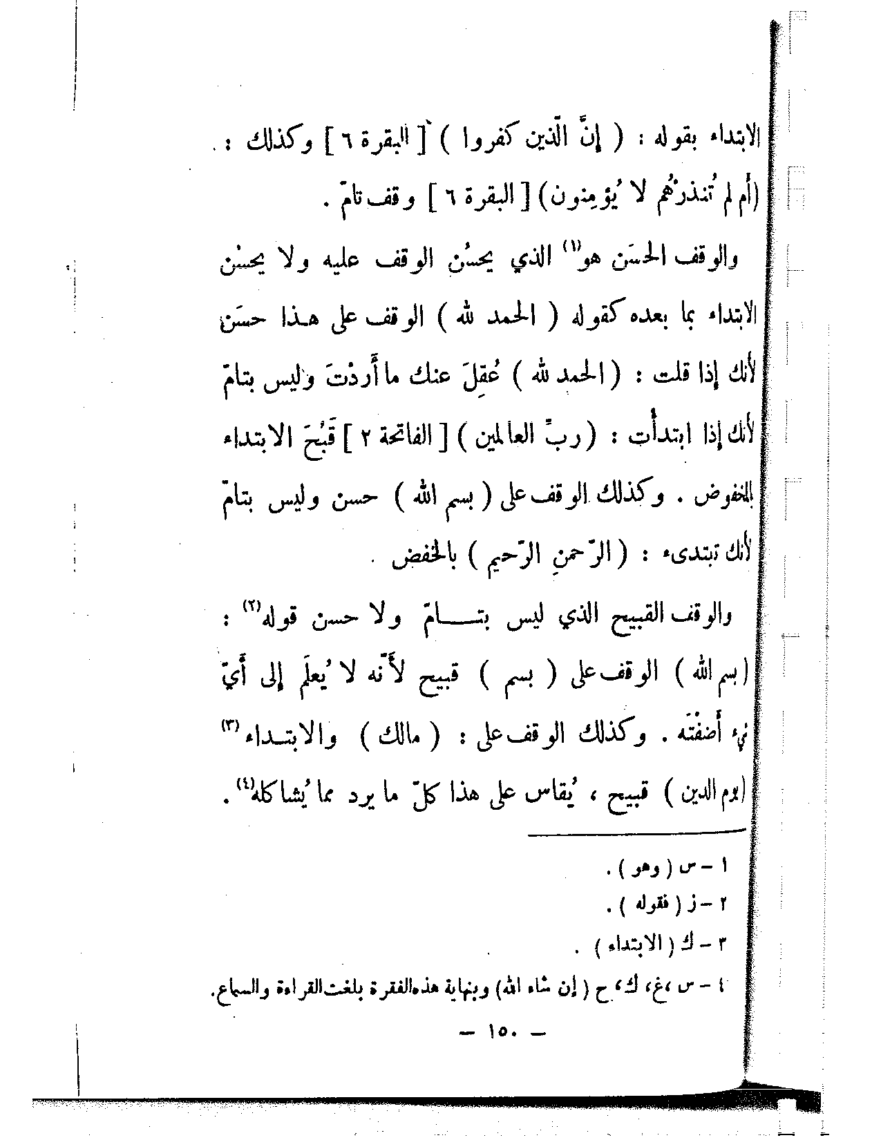 والوقف القبيح الذي ليس بتام ولا حسن قوله: (بسم الله) الوقف على (بسم) قبيح لأنه لا يعلم إلى أي شيء أضفته. وكذلك الوقف على: (مالك) والابتداء (يوم الدين) قبيح، يُقاس على هذا كل ما يرد مما يشاكله.