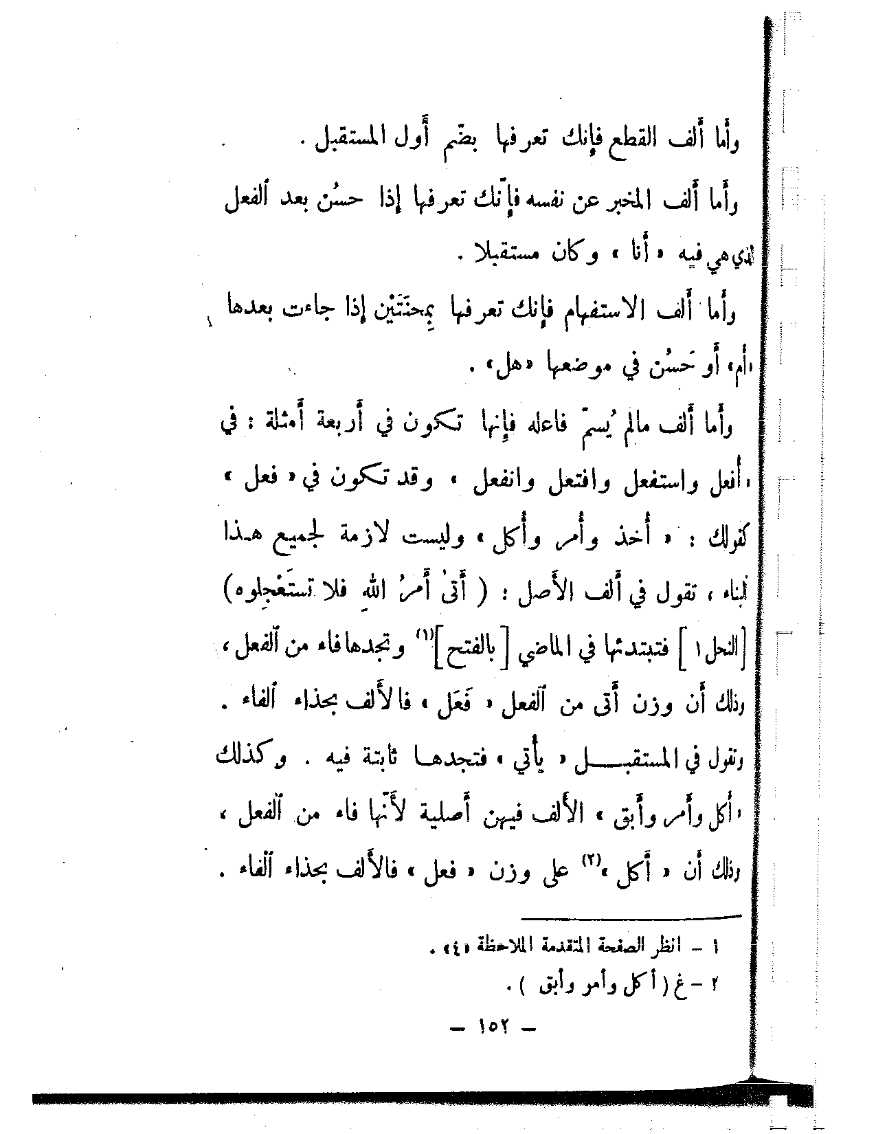 وأما ألف ما لم يسم فاعله فإنها تكون في أربعة أمثلة: في «افعل واستفعل وافتعل وانفعل» وقد تكون في «فعل» كقولك: «أخذ وأمر وأكل» وليست لازمة لجميع هذا البناء، تقول في ألف الأصل: {أتى أمر الله فلا تستعجلوه} [النحل: 1] فتبتدئها في الماضي [بالفتح] وتجدها فاء من الفعل، وذلك أن وزن أتى من الفعل «فعل» فالألف بحذاء الفاء. وتقول في المستقبل «يأتي» فتجدها ثابتة فيه. وكذلك «أكل وأمر وأبق» الألف فيهن أصلية لأنها فاء من الفعل، وذلك أن «أكل» على وزن «فعل» فالألف بحذاء الفاء.
