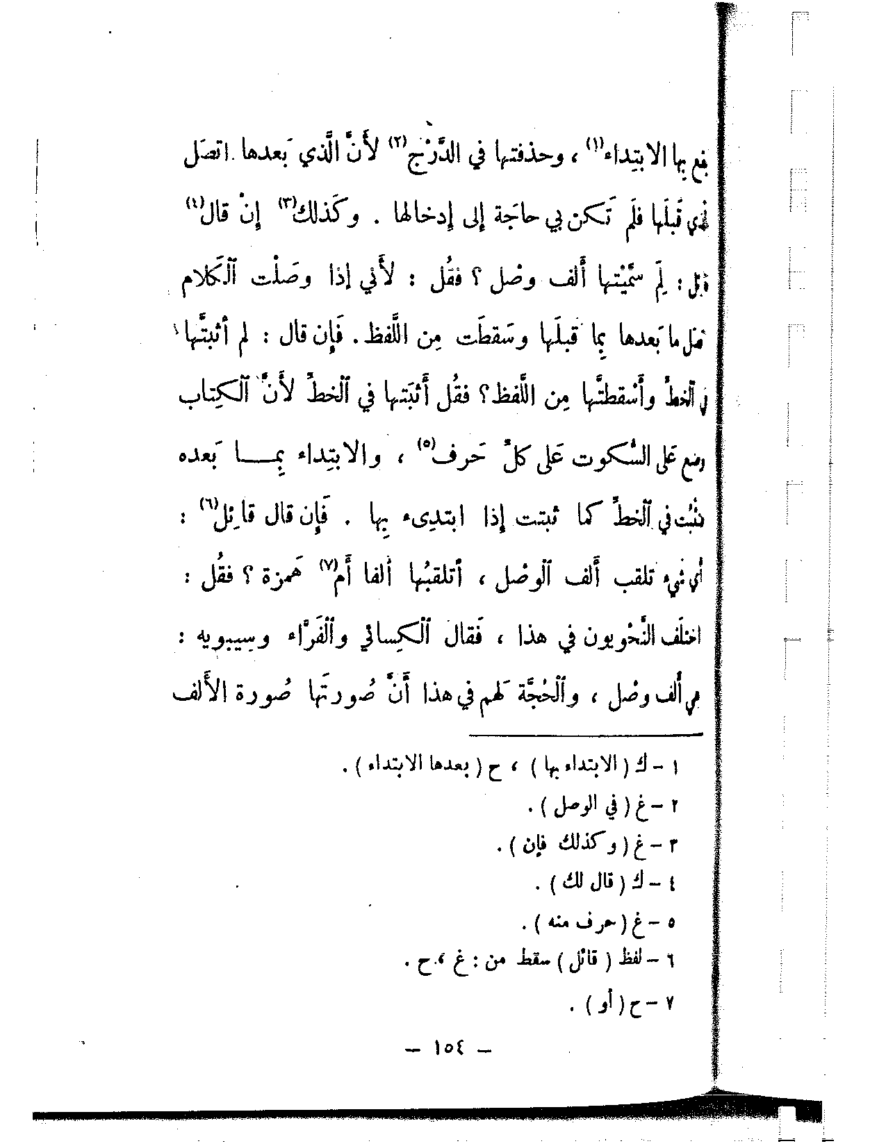 يقع بها الابتداء، وحذفتها في الدرج لأن الذي بعدها اتصل لدي قبلها فلم تكن بي حاجة إلى إدخالها. وكذلك إن قال قائل: لم سميتها ألف وصل؟ فقل: لأني إذا وصلت الكلام قبل ما بعدها بما قبلها وسقطت من اللفظ. فإن قال: لم أثبتها في الخط وأسقطتها من اللفظ؟ فقل أثبتها في الخط لأن الكتاب وضع على السكوت على كل حرف، والابتداء بما بعده تثبت في الخط كما ثبتت إذا ابتدئ بها. فإن قال قائل: أي شيء تلقب ألف الوصل، أتلقبها ألفا أم همزة؟ فقل: اختلف النحويون في هذا، فقال الكسائي والفراء وسيبويه: في ألف وصل، والحجة لهم في هذا أن صورتها صورة الألف