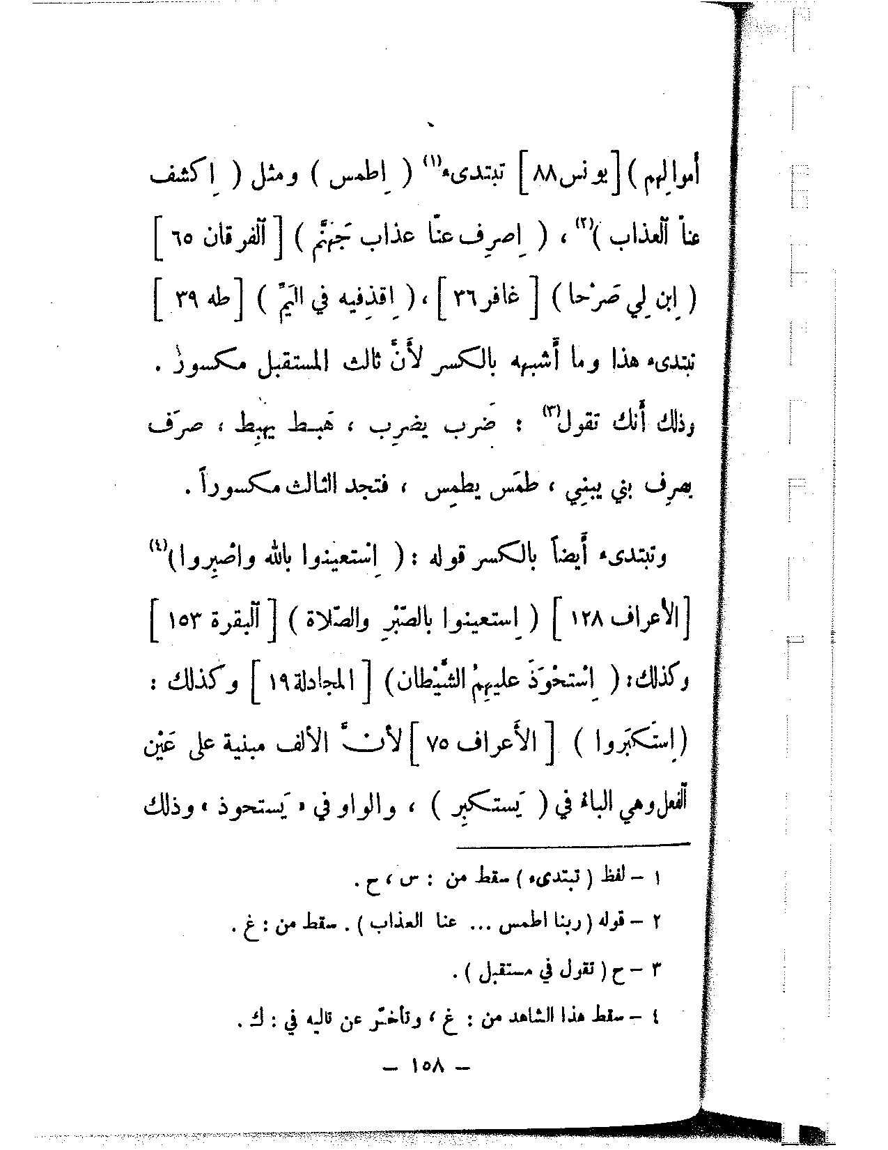وتبتدئ أيضًا بالكسر قوله: {استعينوا بالله واصبروا} [الأعراف: 128] {استعينوا بالصبر والصلاة} [البقرة: 153] وكذلك: {استحوذ عليهم الشيطان} [المجادلة: 19] وكذلك: {استكبروا} [الأعراف: 75] لأن الألف مبنية على عين الفعل وهي الباء في (يستكبر)، والواو في «يستحوذ» وذلك