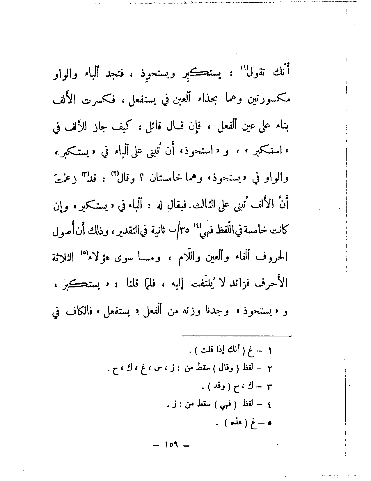 أنك تقول: يستكبر ويستحوذ، فتجد الباء والواو مكسورتين وهما بحذاء العين في يستفعل، فكسرت الألف بناء على عين الفعل، فإن قال قائل: كيف جاز للألف في «استكبر»، و «استحوذ» أن تُبنى على الباء في «يستكبر» والواو في «يستحوذ» وهما خامستان؟ وال: قد زعمت أن الألف تُبنى على الثالث. فيقال له: الباء في يستكبر وإن كانت خامسة في اللفظ فهي ثانية في التقدير، وذلك أن أصول الحروف الفاء والعين واللام، وما سوى هؤلاء الثلاثة الأحرف فزائد لا يلتفت إليه، فلما قلنا: «يستكبر» و «يستحوذ» وجدنا وزنه من الفعل «يستفعل» فالكاف في