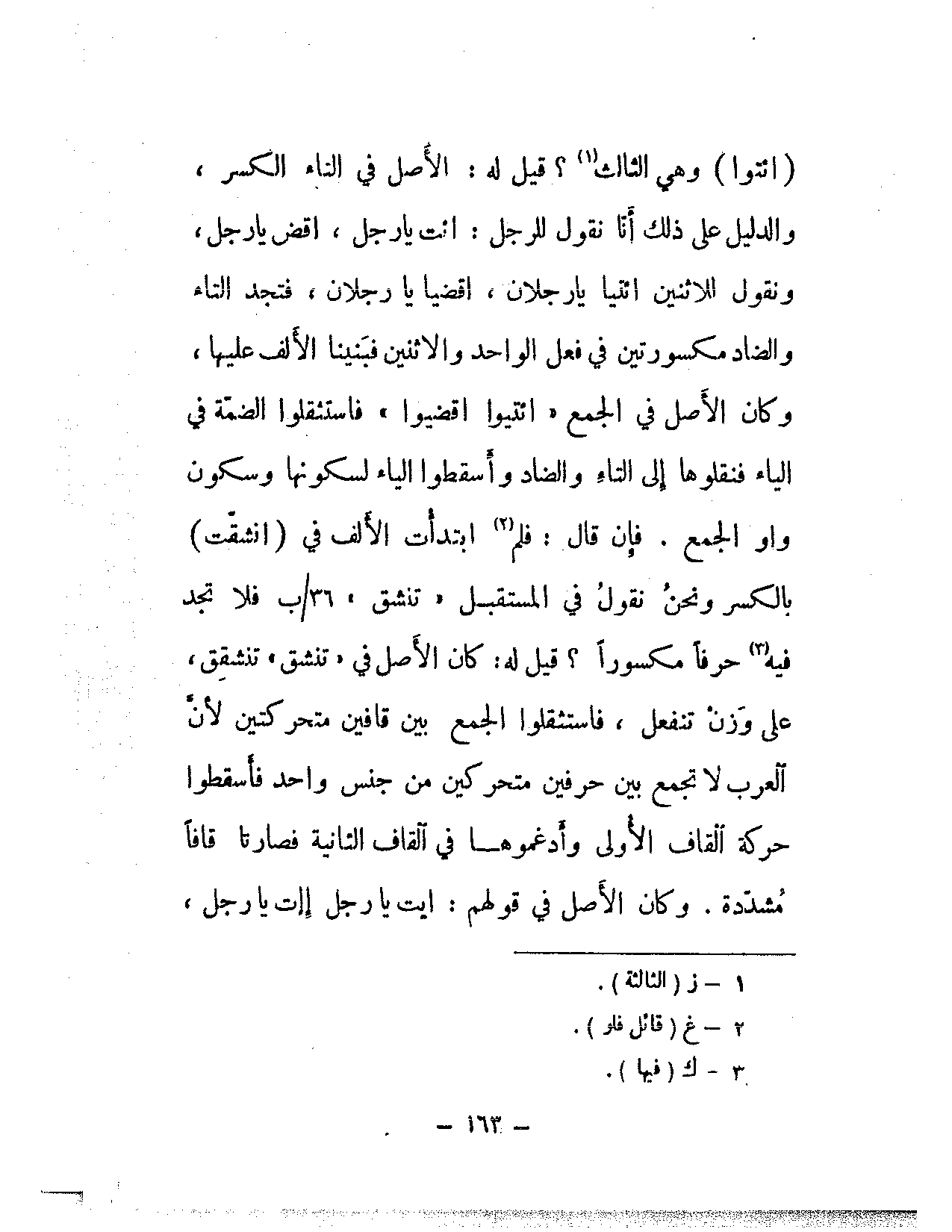 (ائتوا) وهي الثالث؟ قيل له: الأصل في التاء الكسر، والدليل على ذلك أنا نقول للرجل: أنت يا رجل، اقضي يا رجل، ونقول للاثنين ائتيا يا رجلان، اقضيا يا رجلان، فتجد التاء والضاد مكسورتين في فعل الواحد والاثنين فبنينا الألف عليها، وكان الأصل في الجمع «ائتيوا اقضيوا» فاستثقلوا الضمة في الياء فنقلوها إلى التاء والضاد وأسقطوا الياء لسكونها وسكون واو الجمع. فإن قال: فلم ابتدأت الألف في (انشقت) بالكسر ونحن نقول في المستقبل «تنشق» فلا تجد فيه حرفًا مكسورًا؟ قيل له: كان الأصل في «تنشق» تنشقق، على وزن تنفعل، فاستثقلوا الجمع بين قافين متحركتين لأن العرب لا تجمع بين حرفين متحركين من جنس واحد فأسقطوا حركة القاف الأولى وأدغموها في القاف الثانية فصارتا قافًا مشددة. وكان الأصل في قولهم: ايت يا رجل إات يا رجل