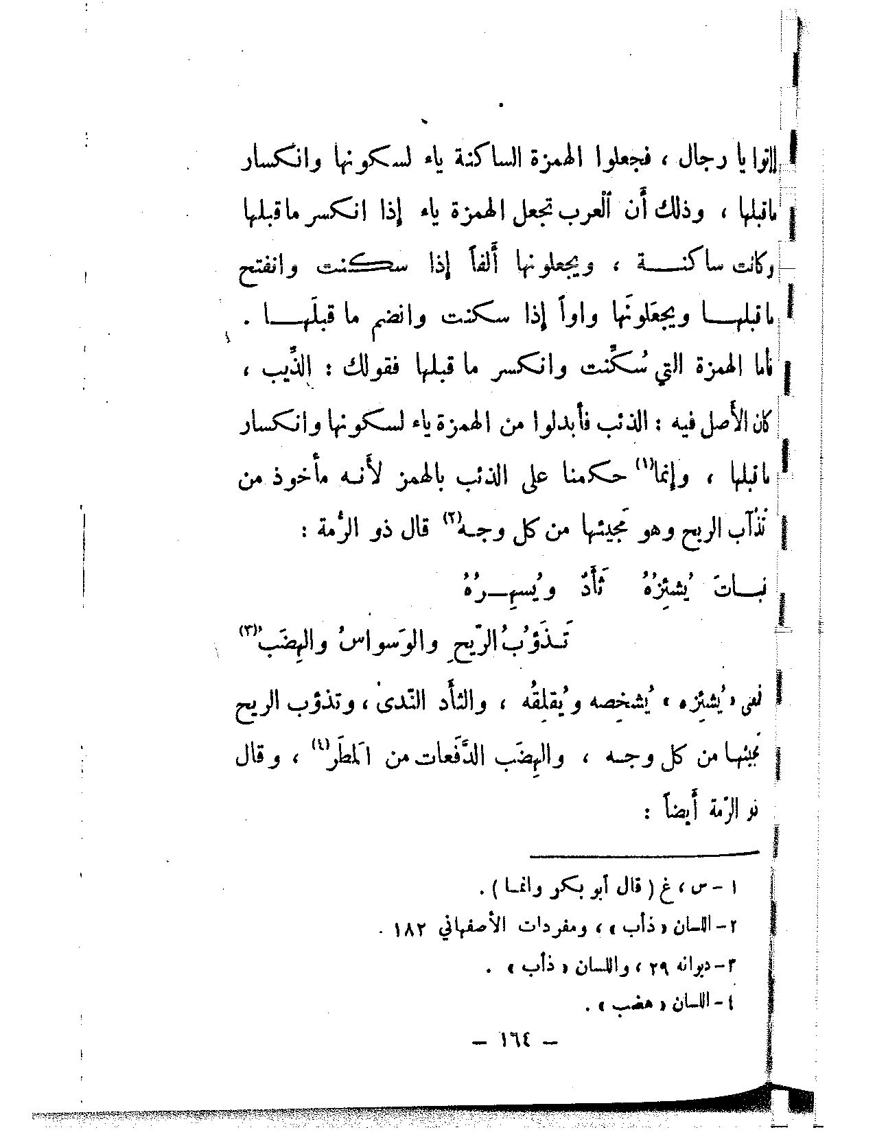 إاتوا يا رجال، فجعلوا الهمزة الساكنة ياء لسكونها وانكسار ما قبلها، وذلك أن العرب تجعل الهمزة ياء إذا انكسر ما قبلها وكانت ساكنة، ويجعلونها ألفًا إذا سكنت وانفتح ما قبلها ويجعلونها واوًا إذا سكنت وانضم ما قبلها. فأما الهمزة التي سكنت وانكسر ما قبلها فقولك: الذيب، كان الأصل فيه: الذئب فأبدلوا من الهمزة ياء لسكونها وانكسار ما قبلها، وإنما حكمنا على الذئب بالهمز لأنه مأخوذ من تذآب الريح وهو مجيئها من كله وجه قال ذو الرمة: