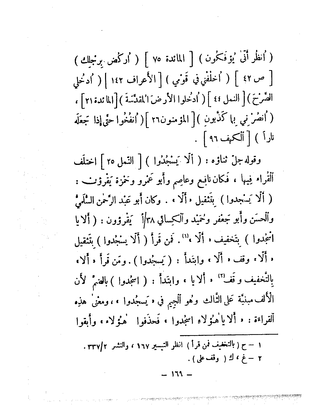 وقوله جل ثناؤه: {ألا يسجدوا} [النمل: 25] اختلف القراء فيها، فكان نافع وعاصم وأبو عمرو وحمزة يقرؤن: (ألا يسجدوا) بتثقيل «ألا». وكان أبو عبد الرحمن السلمي والحسن وأبو جعفر وحميد والكسائي يقرؤون: (ألا يا اسجدوا) بتخفيف «ألا». فمن قرأ (ألا يسجدوا) بتثقيل «ألا» وقف «ألا». فمن قرأ (ألا يسجدوا) بتثقيل «ألا» وقف «ألا» وابتدأ: (يسجدوا). ومن قرأ «ألا» بالتخفيف وقف «ألا يا» وابتدأ: (اسجدوا) بالضم لأن الألف مبنية على الثالث وهو الجيم في «يسجدوا» ومعنى هذه القراءة: «ألا يا هؤلاء اسجدوا» فحذفوا هؤلاء وأبقوا