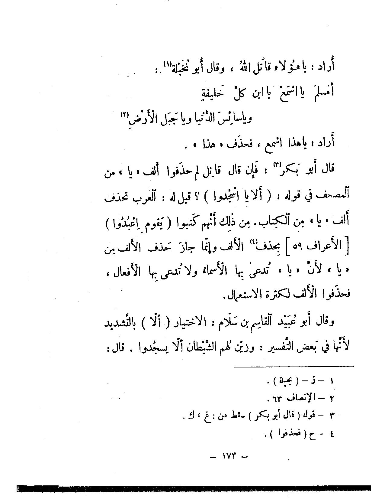 قال أبو بكر: فإن قال قائل لم حذفوا ألف «يا» من المصحف في قوله: (ألا يا اسجدوا)؟ قيل له: العرب تحذف ألف «يا» من الكتاب. من ذلك أنهم كتبوا {يقوم اعبدوا} [الأعراف: 59] بحذف الألف وإنما جاز حذف الألف من «يا» لأن «يا» تدعي بها الأسماء ولا تدعي بها الأفعال، فحذفوا الألف لكثرة الاستعمال.
