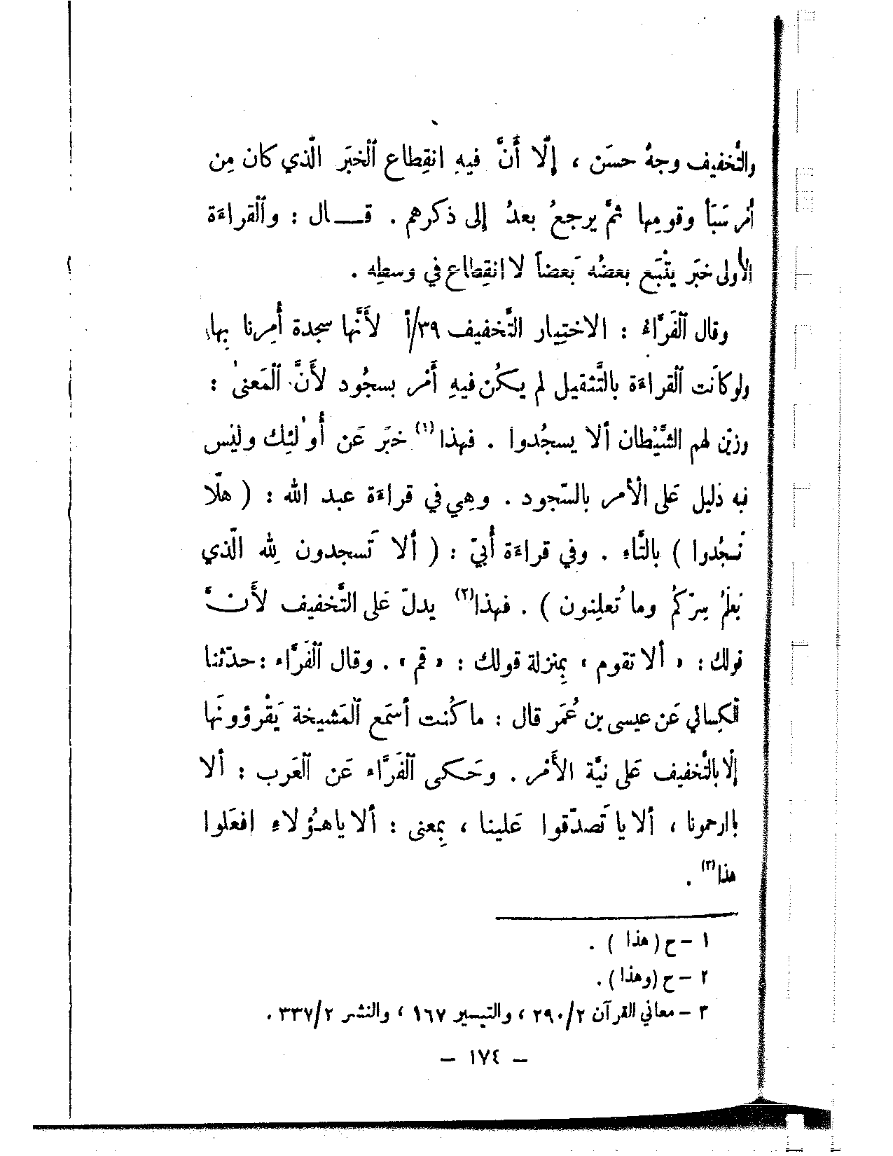 وقال الفراء: الاختيار التخفيف لأنها سجدة أمرنا بها ولو كانت القراءة بالتثقيل لم يكن فيه أمر بسجود لأن المعنى: وزين لهم الشيطان ألا يسجدوا. فهذا خبر عن أولئك وليس فيه دليل على الأمر بالسجود. وهي في قراءة عبد الله: (هلا تسجدوا) بالتاء. وفي قراءة أبي: (ألا تسجدون لله الذي يعلم سركم وما تعلنون). فهذا يدل على التخفيف لأن قولك: «ألا تقوم» بمنزلة قولك: «قم». وقال الفراء: حدثنا الكسائي عن عيسى بن عمر قال: ما كنت أسمع المشيخة يقرؤونها إلا بالتخفيف على نية الأمر. وحكى الفراء عن العرب: ألا يا ارحمونا، ألا يا تصدقوا علينا، بمعنى: ألا يا هؤلاء افعلوا هذا.