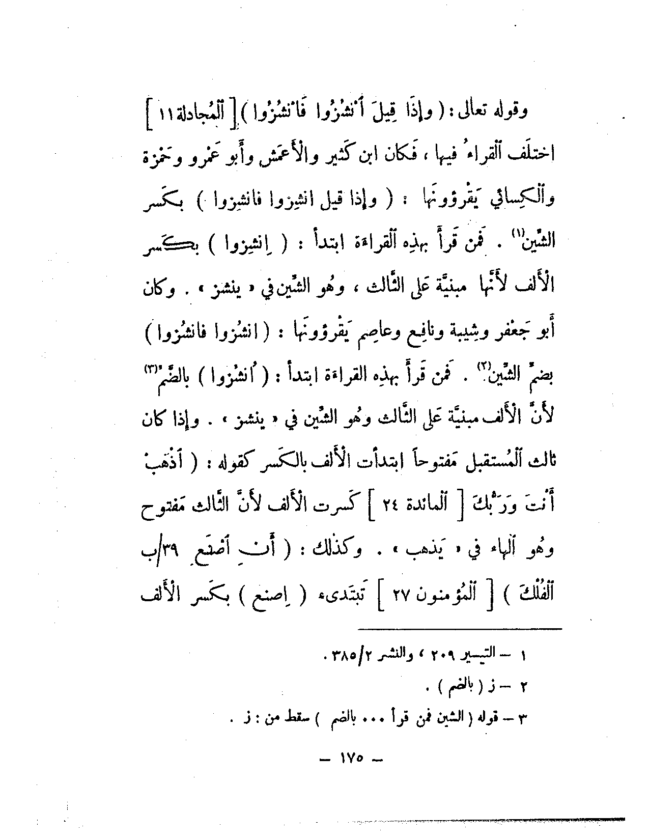 وقوله تعالى: {وإذا قيل انشزوا فانشزوا} [المجادلة: 11] اختلف القراء فيها، فكان ابن كثير والأعمش وأبو عمرو وحمزة والكسائي يقرؤونها: (وإذا قيل انشزوا فانشزوا) بكسر الشين. فمن قرأ بهذه القراءة ابتدأ: (انشزوا) بكسر الألف لأنها مبنية على الثالث، وهو الشين في «ينشز». وكان أبو جعفر وشيبة ونافع وعاصم يقرؤونها: (انشزوا فانشزوا) بضم الشين. فمن قرأ بهذه القراءة ابتدأ: (انشزوا) بالضم لأن الألف مبنية على الثالث وهو الشين في «ينشز». وإذا كان ثالث المستقبل مفتوحا ابتدأت الألف بالكسر كقوله: {اذهب أنت وربك} [المائدة: 24] كسرت الألف لأن الثالث مفتوح وهو الهاء في «يذهب». وكذلك: {أن اصنع الفلك} [المؤمنون: 27] تبتدئ (اصنع) بكسر الألف