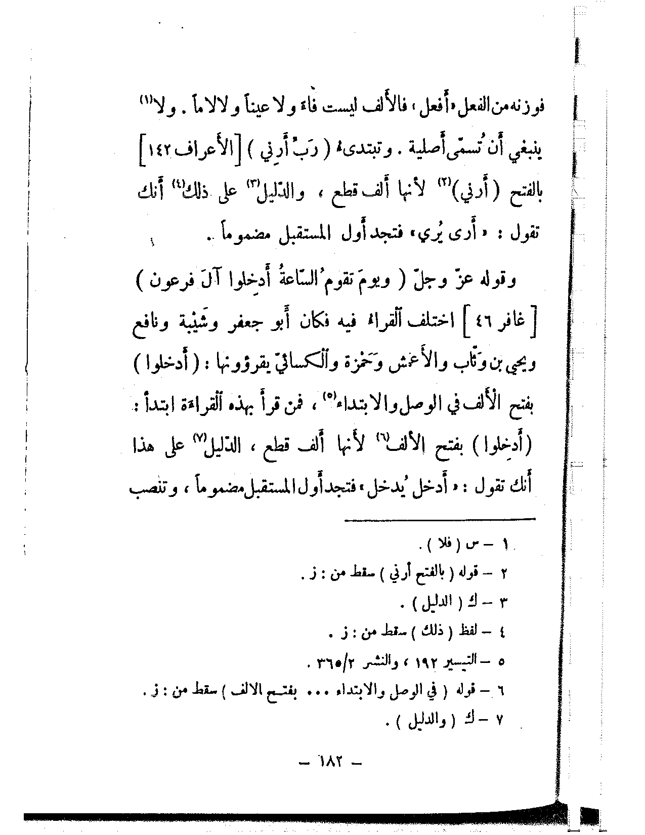 فوزنه من الفعل «أفعل» فالألف ليست فاء ولا عينًا ولا لامصا. ولا ينبغي أن تسمى أصلية. وتبتدئ {رب أرني} [الأعراف: 142] بالفتح (أرني) لأنها ألف قطع، والدليل على ذلك أنك تقول: «أرى يُري» فتجد أول المستقبل مضمومًا.