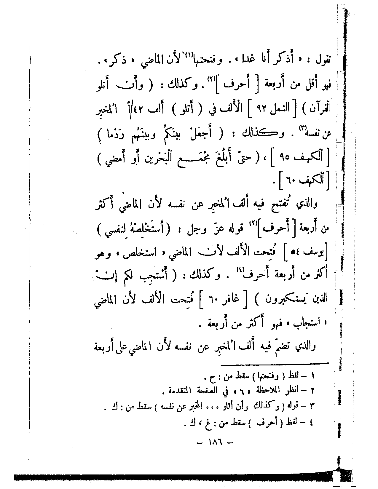 تقول: «أذكر أنا غدا». وفتحتها لأن الماضي «ذكر». فهو أقل من أربعة [أحرف]. وكذلك: {وأن أتلو القرآن} [النمل: 92] الألف في (أتلو) ألف المخبر عن نفسه. وكذلك: {أجعل بينكم وبينهم ردما} [الكهف: 95]، {حتى أبلغ مجمع البحرين أو أمضي} [الكهف: 60]