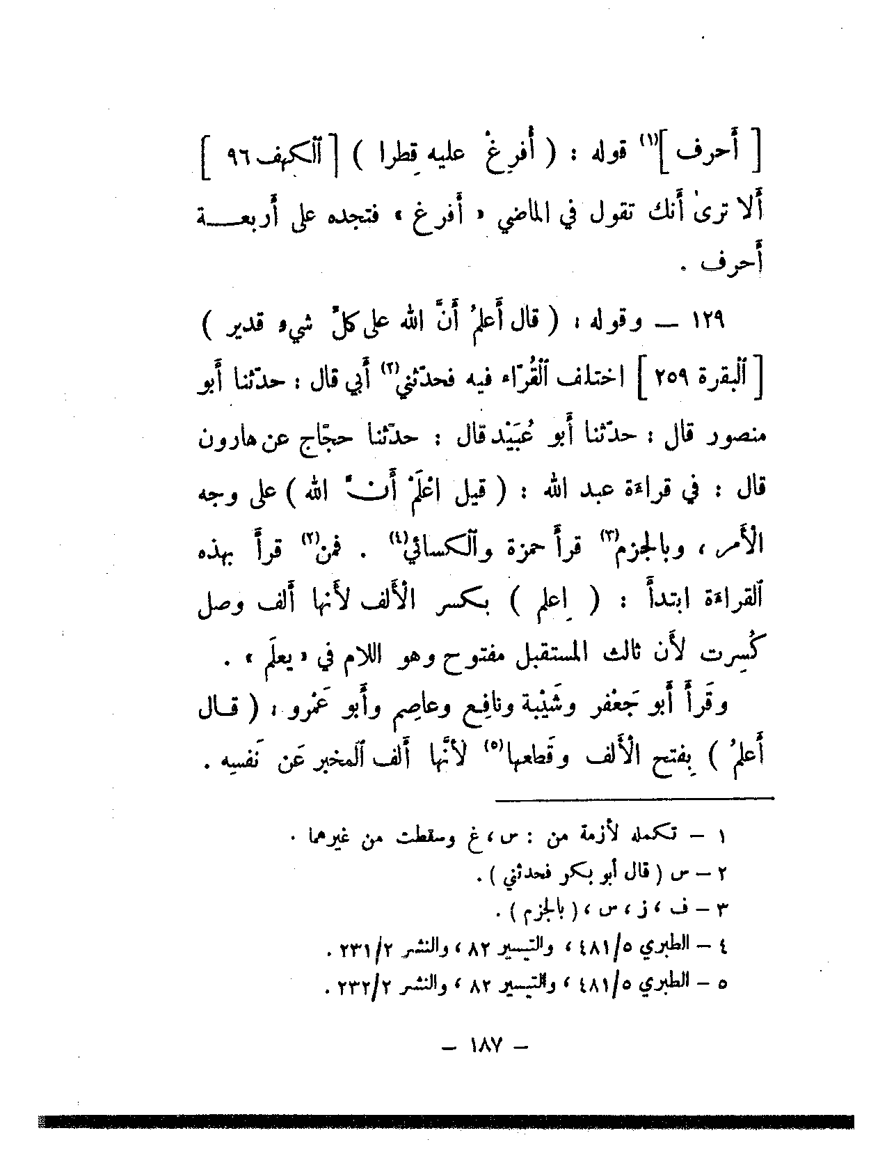129 - وقوله: {قال أعلم أن الله على كل شيء قدير} [البقرة: 259] اختلف القراء فيه فحدثني أبي قال: حدثنا أبو منصور قال: حدثنا أبو عبيد قال: حدثنا حجاج عن هارون قال: في قراءة عبد الله: (قيل اعلم أن الله) على وجه الأمر، وبالجزم قرأ حمزة والكسائي. فمن قرأ بهذه القراءة ابتدأ: (اعلم) بكسر الألف لأنها ألف وصل كسرت لأن ثالث المستقبل مفتوح وهو اللام في «يعلم».
