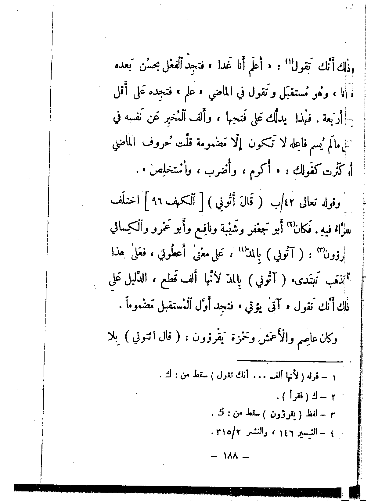 وقوله تعالى {قال أتوني} [الكهف: 96] اختلف الفراء فيه. فكان أبو جعفر وشيبة ونافع وأبو عمرو والكسائي يقرؤون: (آتوني) بالمد، على معنى أعطوني، فعلى هذا المذهب تبتدئ (آتوني) بالمد لأنها ألف قطع، الدليل على ذلك أنك تقول «آتي يؤتي» فتجد أول المستقبل مضمومًا.