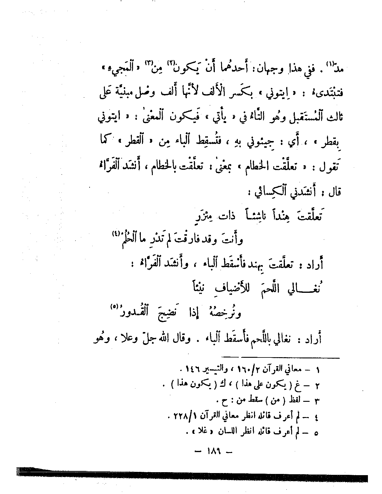 مد. ففي هذا وجهان: أحدهما أن يكون من «المجيء» فتبتدئ: «ايتوني» بكسر الألف لأنها ألف وصل مبنية على ثالث المستقبل وهو التاء في «يأتي» فيكون المعنى: «ايتوني بقطر»، أي: جيئوني به، فتسقط الباء من «القطر» كما تقول: «تعلقت الخطام» بمعنى: تعلقت بالخطام، أنشد الفراء قال: أنشدني الكسائي: