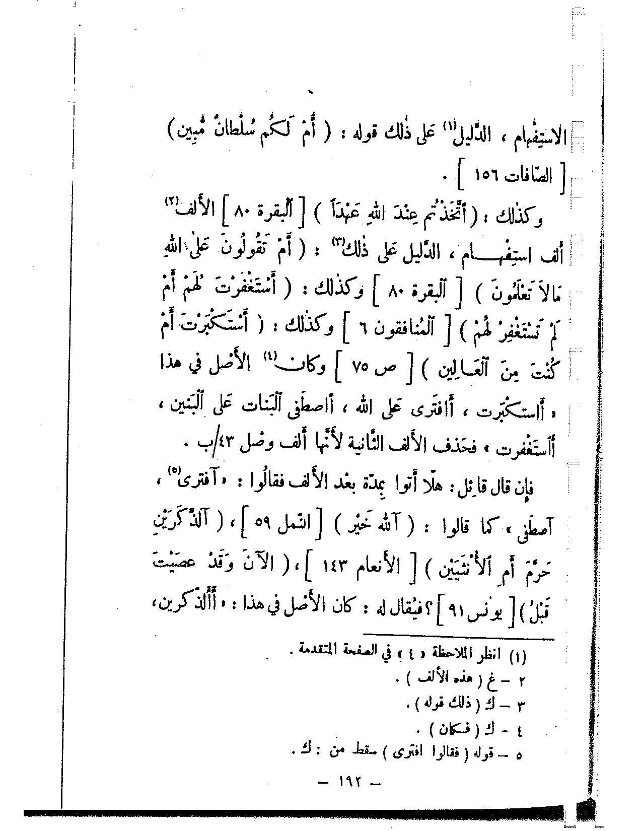 وكذلك: «{اتخذتم عند الله عهدا} [البقرة: 80] الألف ألف استفهام، الدليل على ذلك: {أم تقولون على الله ما لا تعلمون} [البقرة: 80] وكذلك: {أستغفرت لهم أم لم تستغفر لهم} [المنافقون: 6] وكذلك: {أستكبرت أم كنت من العالين} [ص: 75] وكان الأصل في هذا «أاستكبرت، أافترى على الله، أاصطفى البنات على البنين، أاستغفرت» فحذف الألف الثانية لأنها ألف وصل.