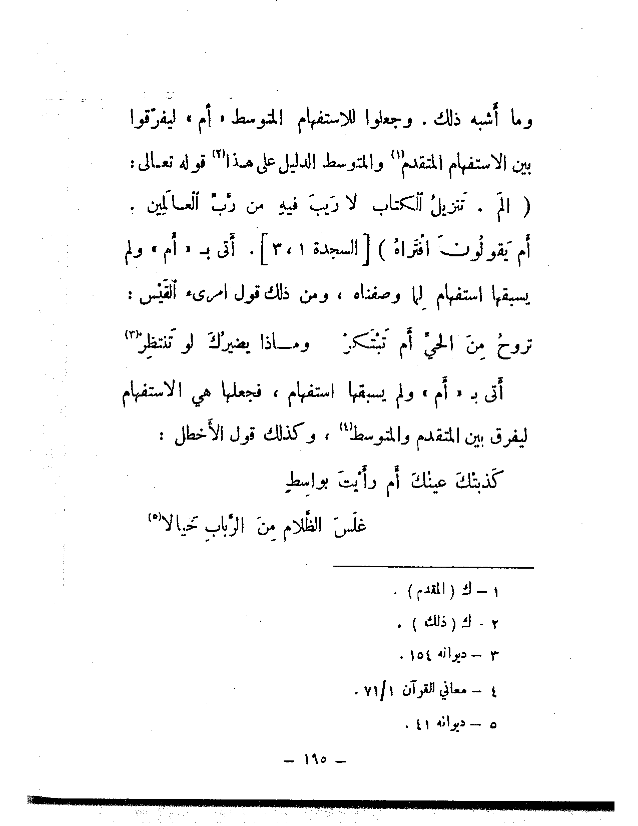 وما أشبه ذلك. وجعلوا للاستفهام المتوسط «أم» ليفرقوا بين الاستفهام المتقدم والمتوسط الدليل على هذا قوله تعالى: {الم. تنزيل الكتاب لا ريب فيه من رب العالمين. أم يقولون افتراه} [السجدة: 1، 3]. أتى بـ «أم» ولم يسبقها استفهام لما وصفناه، ومن ذلك قول امرئ القيس: