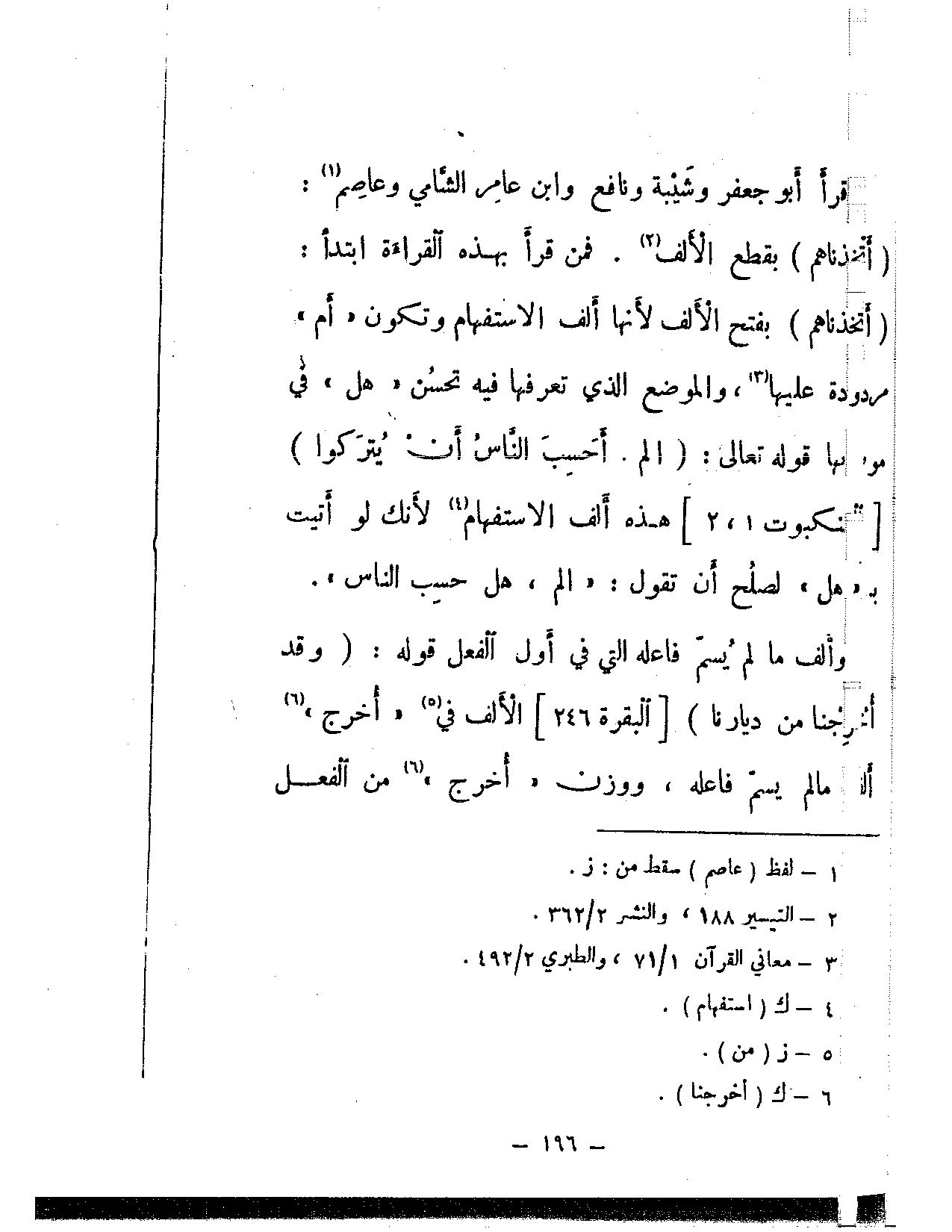 قرأ أبو جعفر وشيبة ونافع وابن عامر الشامي وعاصم: (أتخذناهم) بقطع الألف. فمن قرأ بهذه القراءة ابتدأ: (أتخذناهم) بفتح الألف لأنها ألف الاستفهام وتكون «أم» مردودة عليها، والموضع الذي تعرفها فيه تحسُن «هل» في موضعها قوله تعالى: {الم. أحسب الناس أن يتركوا} [العنكبوت: 1، 2] هذه ألف الاستفهام لأنك لو أتيت بـ «هل» لصلح أن تقول: «الم، حل حسب الناس».