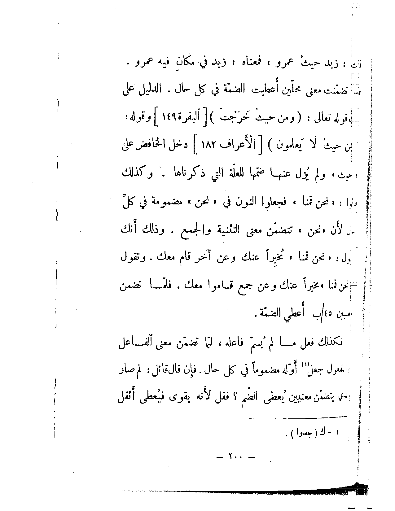 قلت: زيد حيث عمرو، فمعناه: زيد في مكان فيه عمرو. وما تضمنت معنى محلين أعطيت الضمة في كل حال. الدليل على قوله تعالى: {ومن حيث خرجت} [البقرة: 149] وقوله: {من حيث لا يعلمون} [الأعراف: 182] دخل الخافض على «حيث» ولم يزل عنها ضمها للعلة التي ذكرناها. وكذلك قالوا: «نحن قمنا» فجعلوا النون في «نحن» مضمومة في كل حال لأن «نحن» تتضمن معنى التثنية والجمع. وذلك أنك تقول «نحن قمنا» مخبرًا عنك وعن آخر قام معك. وتقول نحن قمنا مخبرًا عنك وعن جمع قاموا معك. فلما تضمن معنيين أعطي الضمة.