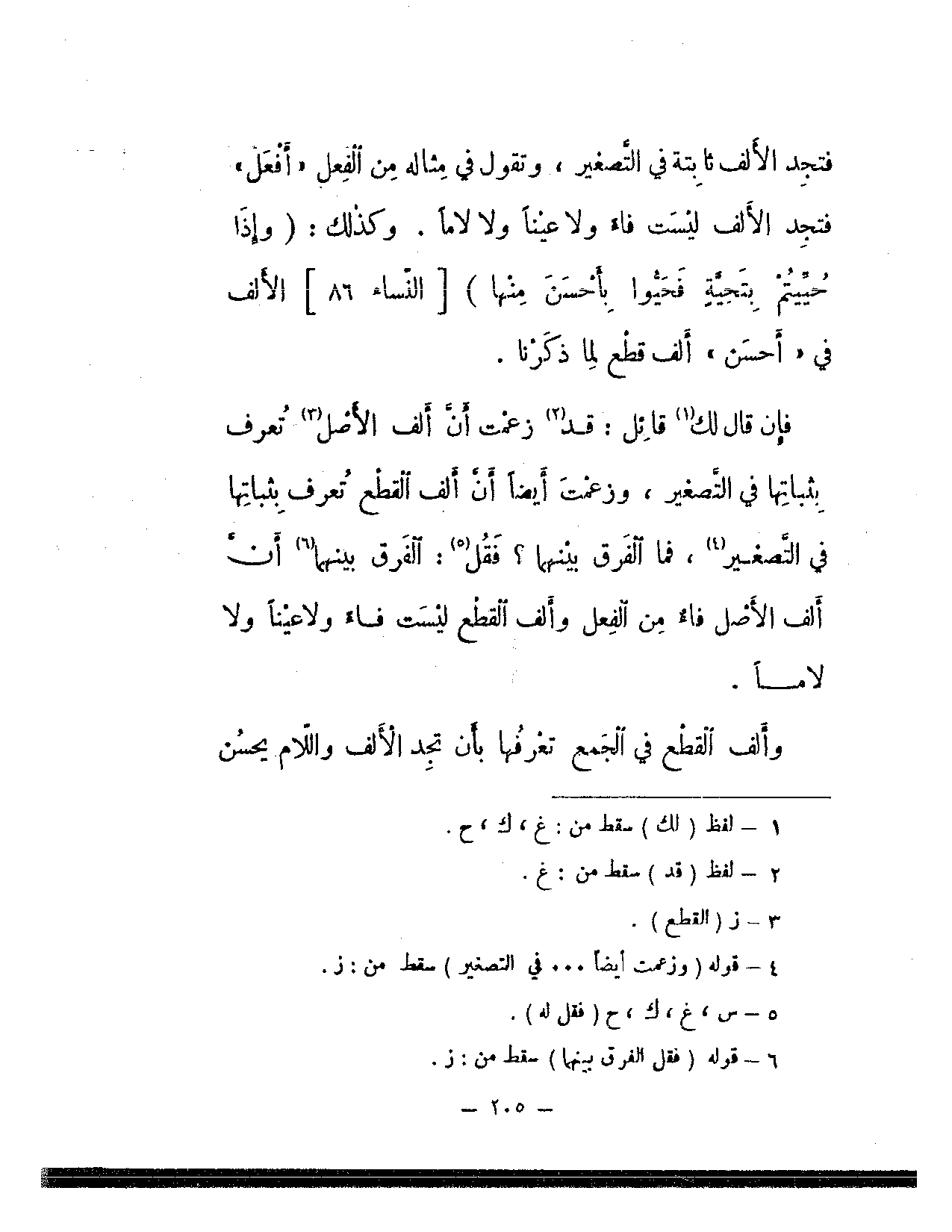 فتجد الألف ثابتة في التصغير، وتقول في مثاله من الفعل «أفعل» فتجد الألف ليست فاء ولا عينًا ولا لامًا. وكذلك: {وإذا حييتم بتحية فحيوا بأحسن منها} [النساء: 86] الألف في «أحسن» ألف قطع لما ذكرنا.