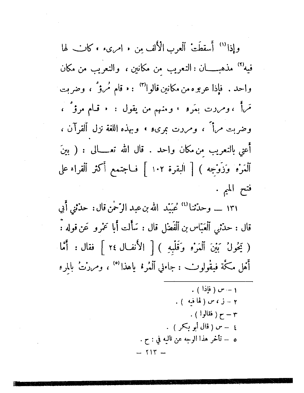 131 - وحدثنا عبيد الله بن عبد الرحمن قال: حدثني أبي قال: حدثني العباس بن الفضل قال: سألت أبا عمرو عن قوله: {يحول بين المرء وقلبه} [الأنفال: 24] فقال: أما أهل مكة فيقولون: جاءني المرء يا هذا، ومررت بالمرء