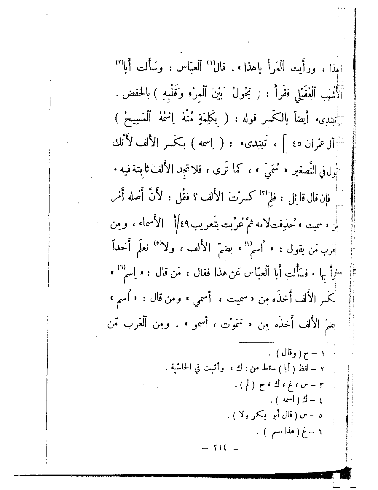 يا هذا، ورأيت المرأ يا هذا. قال العباس: وسألت أبا الأشهب العقيلي فقرأ: (يحول بين المرء وقلبه) بالخفض. تبتدئ أيضًا بالكسر قوله: {بكلمة منه اسمه المسيح} [آل عمران: 45]، تبتدئ: (اسمه) بكسر الألف لأنك تقول في التصغير «سمى»، كما ترى، فلا تجد الألف ثابتة فيه.