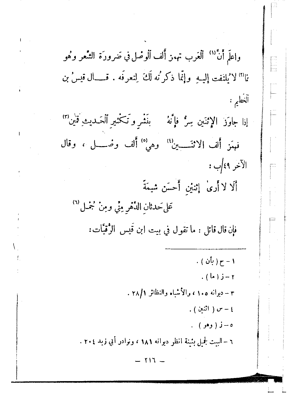 واعلم أن العرب تهمز ألف الوصل في ضرورة الشعر وهو مما لا يلتفت إليه وإنما ذكرته لك لتعرفه. قال قيس بن الخطيم: