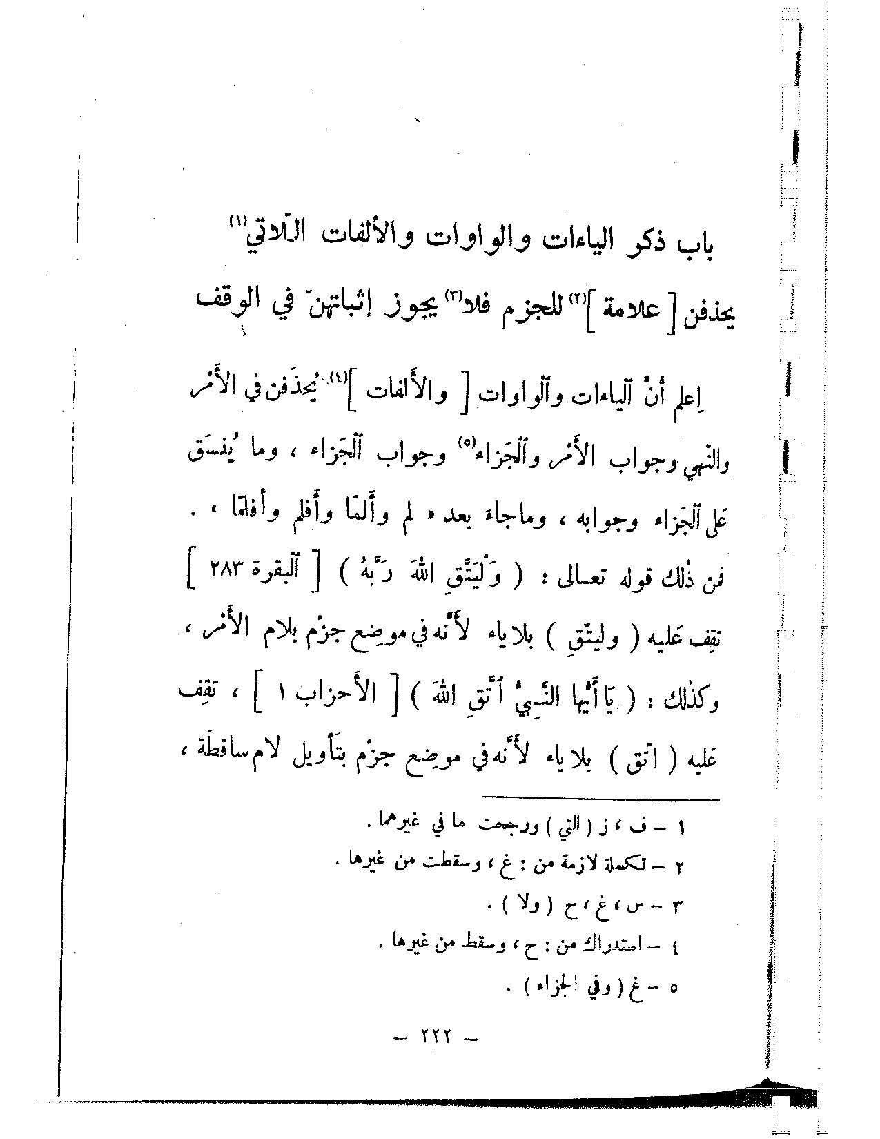 اعلم أن الياءات والواوات [والألفات] يحذفن في الأمر والنهي وجواب الأمر والجزاء وجواب الجزاء، وما ينسق على الجزاء وجوابه، وما جاء بعد «لم وألما وأفلم وأفلما».