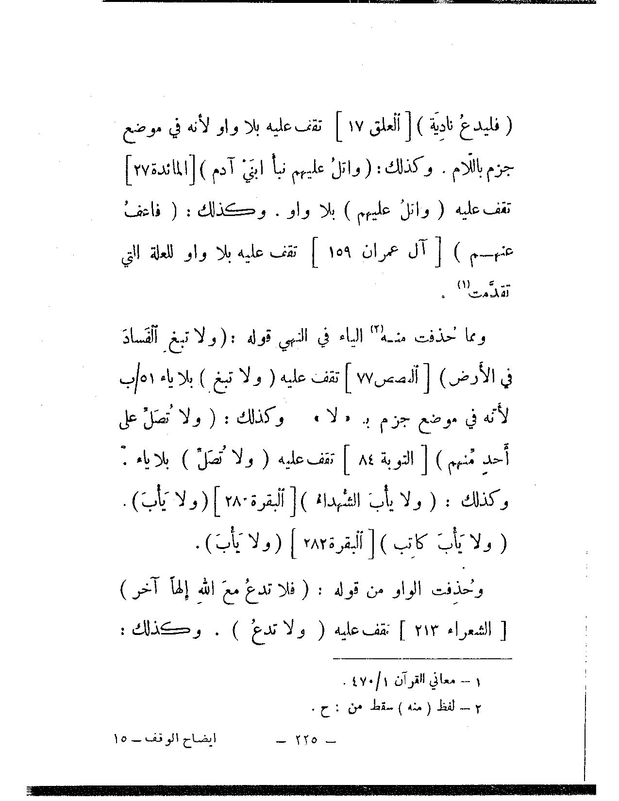 {فليدع نادية} [العلق: 17] تقف عليه بلا واو لأنه في موضع جزم باللام. وكذلك: {واتل عليهم نبأ ابني آدم} [المائدة: 27] تقف عليه (واتل عليهم) بلا واو. وكذلك: {فاعف عنهم} [آل عمران: 159 ي تقف عليه بلا واو للعلة التي تقدمت.