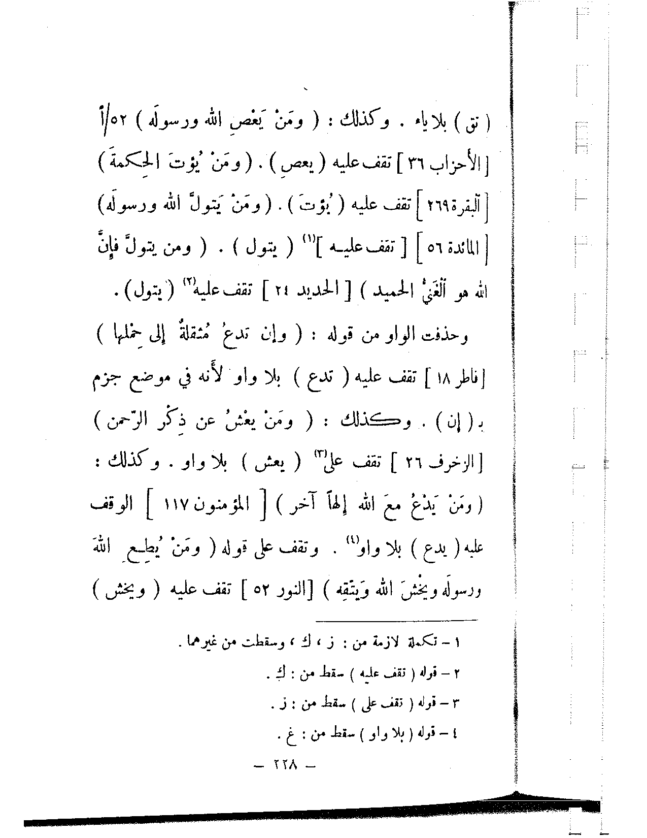 وحذفت الواو من قوله: {وإن تدع مثقلة إلى حملها} [فاطر: 18] تقف عليه (تدع) بلا واو لأنه في موضع جزم بـ (إن). وكذلك: {ومن يعش عن ذكر الرحمن} [الزخرف: 26] تقف على (يعش) بلا واو. وكذلك: {ومن يدع مع الله إلها آخر} [المؤمنون: 117] الوقف عليه (يدع) بلا واو. وتقف على قوله {ومن يطع الله ورسوله ويخش الله ويتقه} [النور: 52] تقف عليه (ويخش)