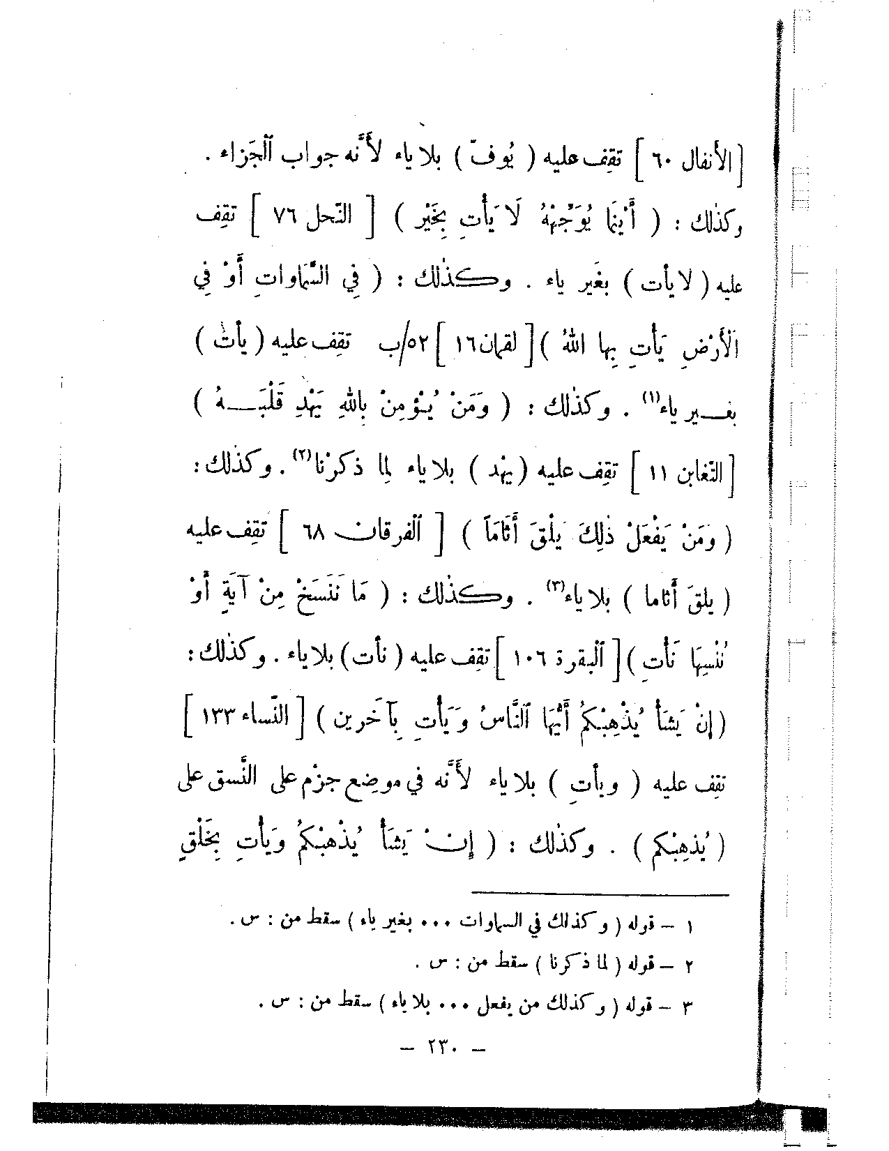 وكذلك: {أينما يوجهه لا يأت بخير} [النحل: 76] تقف عليه (لا يأت) بغير ياء. وكذلك: {في السماوات أو في الأرض يأت بها الله} [لقمان: 16] تقف عليه (يأت) بغير ياء. وكذلك: {ومن يؤمن بالله يهد قلبه} [التغابن: 11] تقف عليه (يهد) بلا ياء لما ذكرنا. وكذلك: {ومن يفعل ذلك يلق أثاما} [الفرقان: 168] تقف عليه (يلق أثاما) [الفرقان: 68] تقف عليه (يلق أثاما) بلا ياء. وكذلك: {ما ننسخ من آية أو ننسها نأت} [البقرة: 106] تقف عليه (نأت) بلا ياء. وكذلك: {إن يشأ يذهبكم أيها الناس ويأت بآخرين} [النساء: 133] تقف عليه (ويأت) بلا ياء لأنه في موضع جزم على النسق على (يذهبكم). وكذلك: {إن يشأ يذهبكم ويأت بخلق