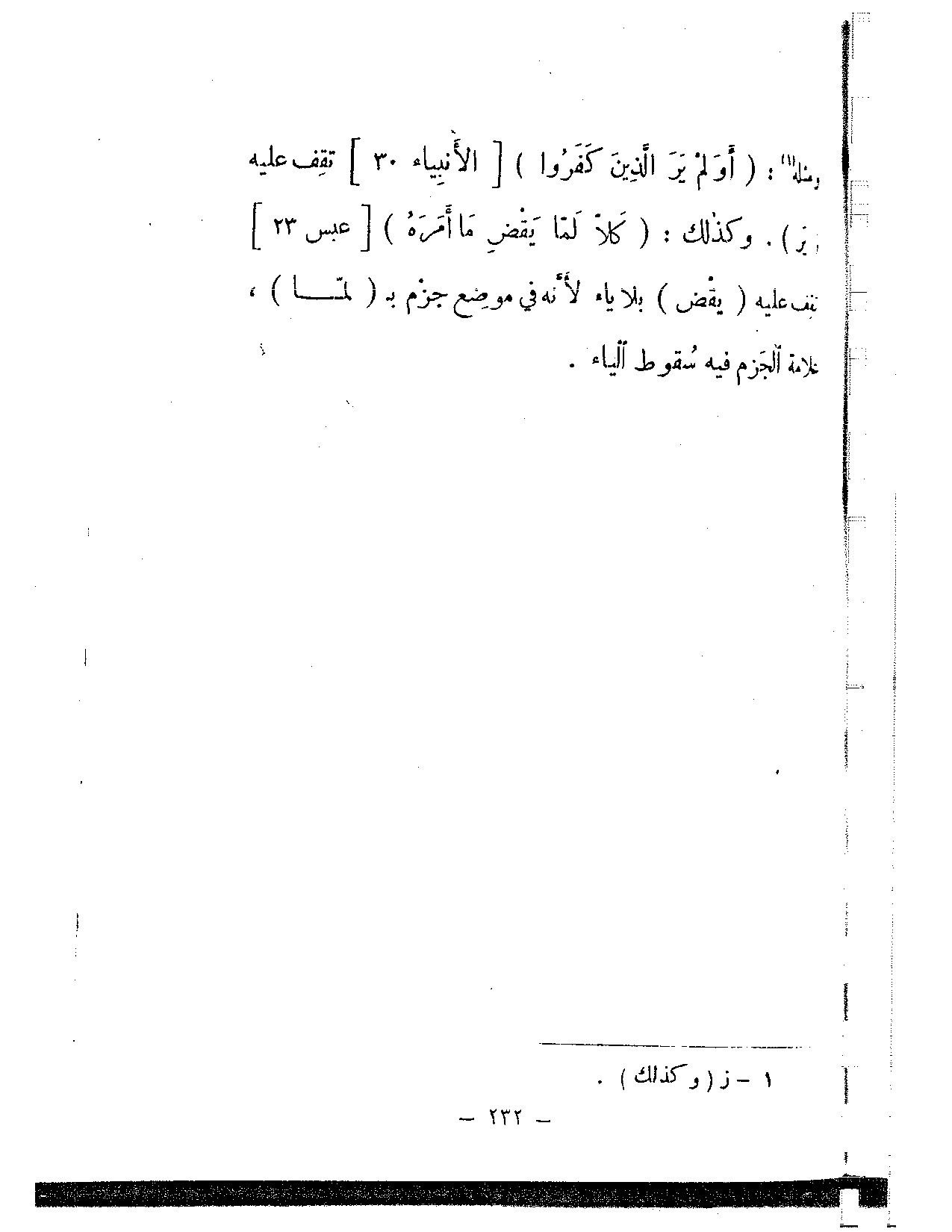 ومثله: {أولم ير الذين كفروا} [الأنبياء: 30] تقف عليه {ير}. وكذلك: {كلا لما يقض ما أمره} [عبس: 23] تقف عليه (يقض) بلا ياء لأنه في موضع جزم بـ (لما)، علامة الجزم فيه سقوط الياء.
