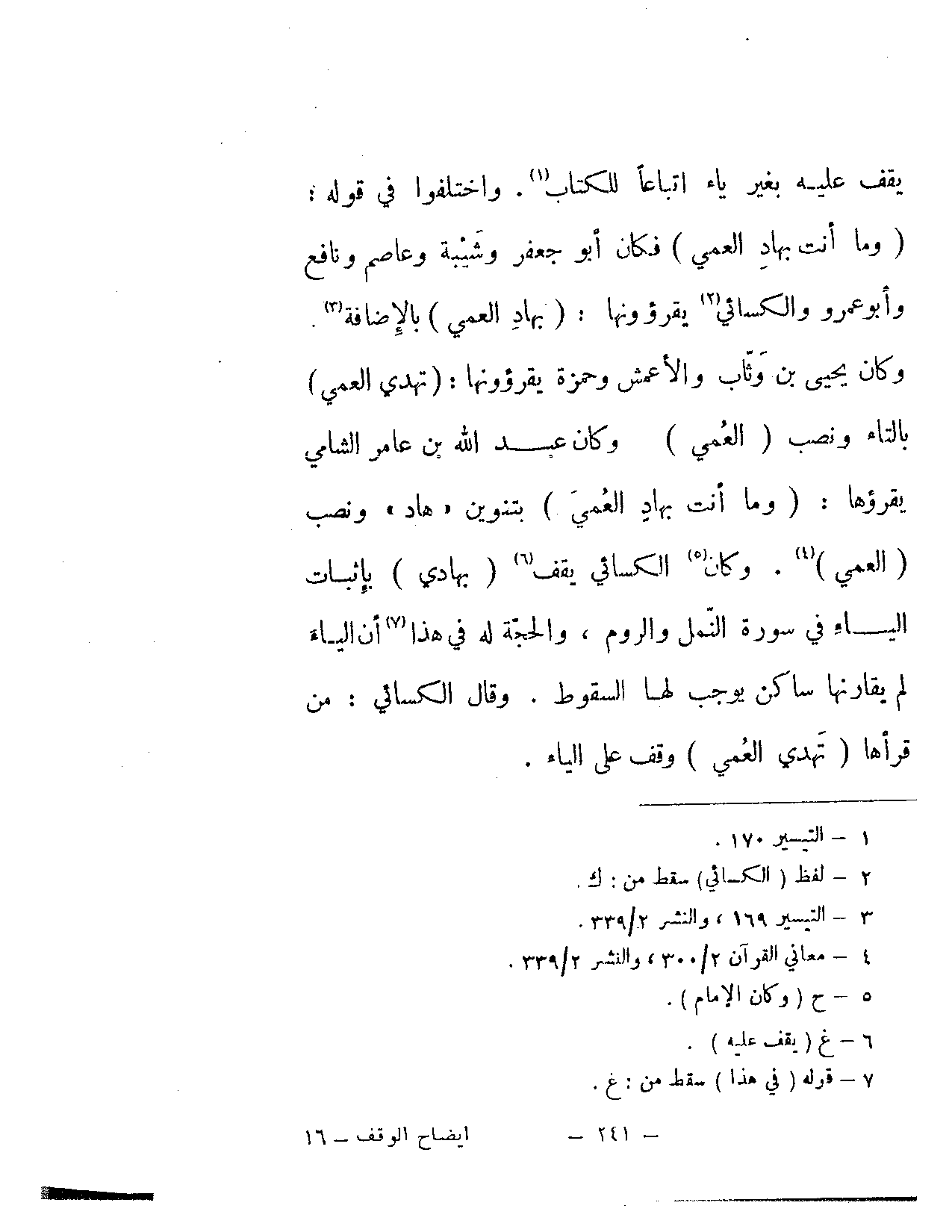 يقف عليه بغير ياء اتباعًا للكتاب. واختلفوا في قوله (وما أنت بهاد العمي) فكان أبو جعفر وشيبة وعاصم ونافع وأبو عمرو والكسائي يقرؤونها: (بهاد العمي) بالإضافة.