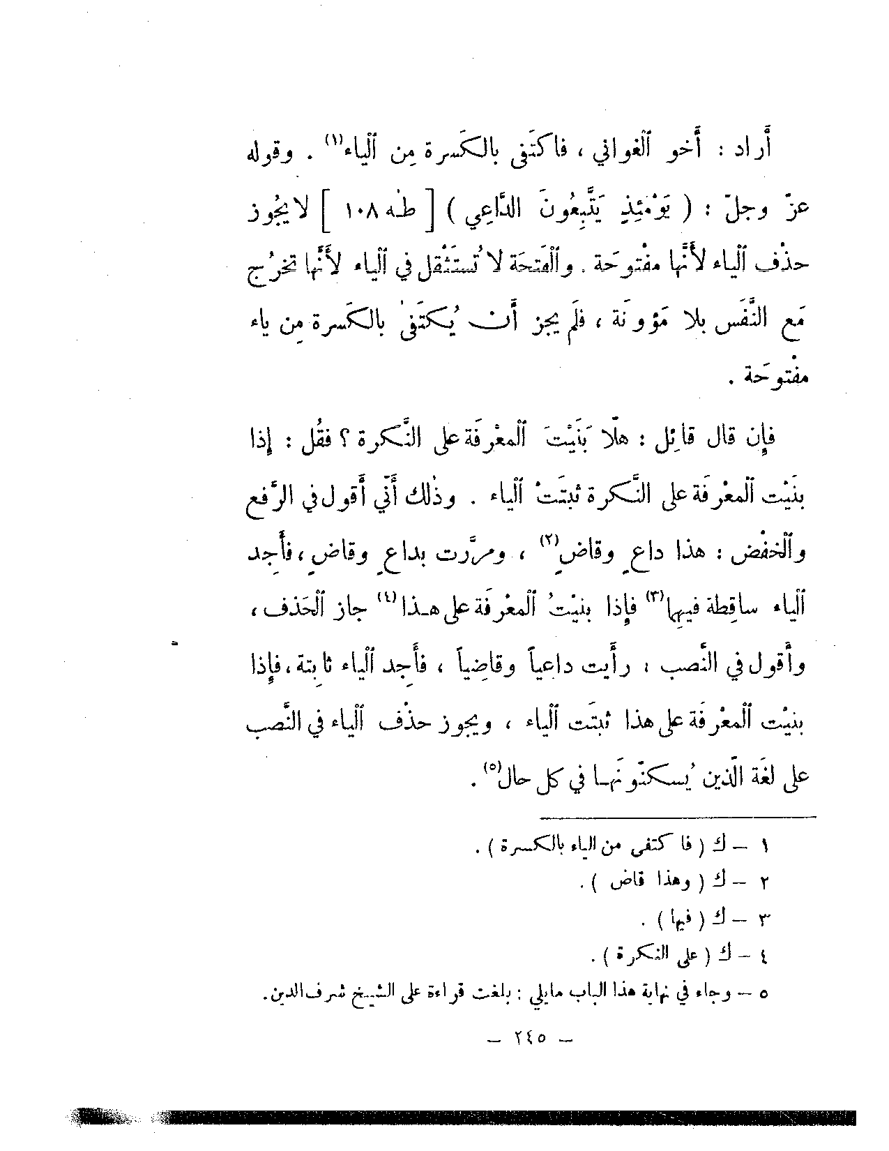 فإن قال قائل: هلا بنيت المعرفة على النكرة؟ فقل: إذا بنيت المعرفة على النكرة ثبتت الياء. وذلك أني أقول في الرفع والخفض: هذا داع وقاض، ومررت بداع وقاض، فأجد الياء ساقطة فيهما فإذا بنيت المعرفة على هذا جاز الحذف، وأقول في النصب: رأيت داعيًا وقاضيًا، فأجد الياء ثابتة، فإذا بنيت المعرفة على هذا ثبتت الياء، ويجوز حذف الياء في النصب على لغة الذين يسكنونها في كل حال.