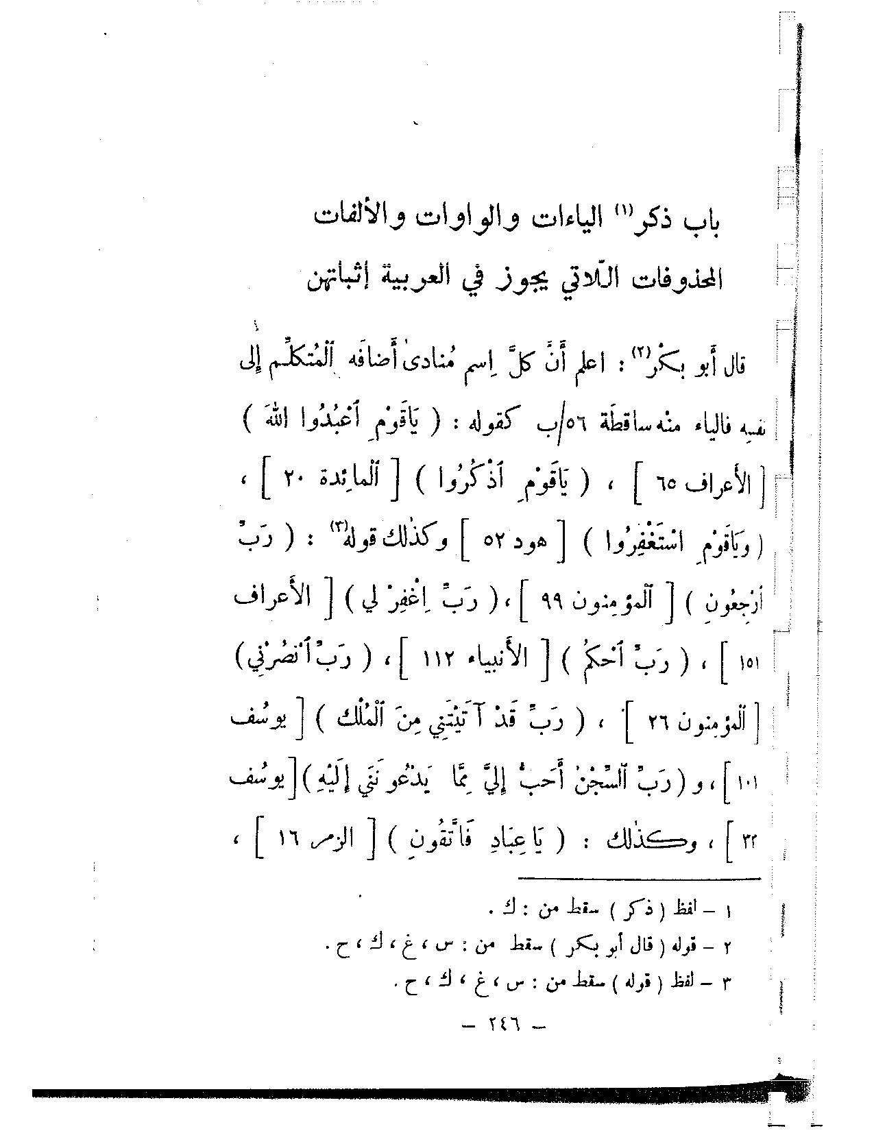 قال أبو بكر: اعلم أن كل اسم منادى أضافه المتكلم إلى نفسه فالياء منه ساقطة كقوله: {يا قوم اعبدوا الله} [الأعراف: 65]، {يا قوم اذكروا} [المائدة: 20]، {ويا قوم استغفروا} [هود: 52] وكذلك قوله: {رب ارجعون} [المؤمنون: 99]، {رب اغفر لي} [الأعراف: 151]، {رب احكم} [الأنبياء: 112]، {رب انصرني} [المؤمنون: 26]، {رب قد آتيتني من الملك} [يوسف: 101]، و {رب السجن أحب إلي مما يدعونني إليه} [يوسف: 33]، وكذلك: {يا عباد فاتقون} [الزمر: 16]