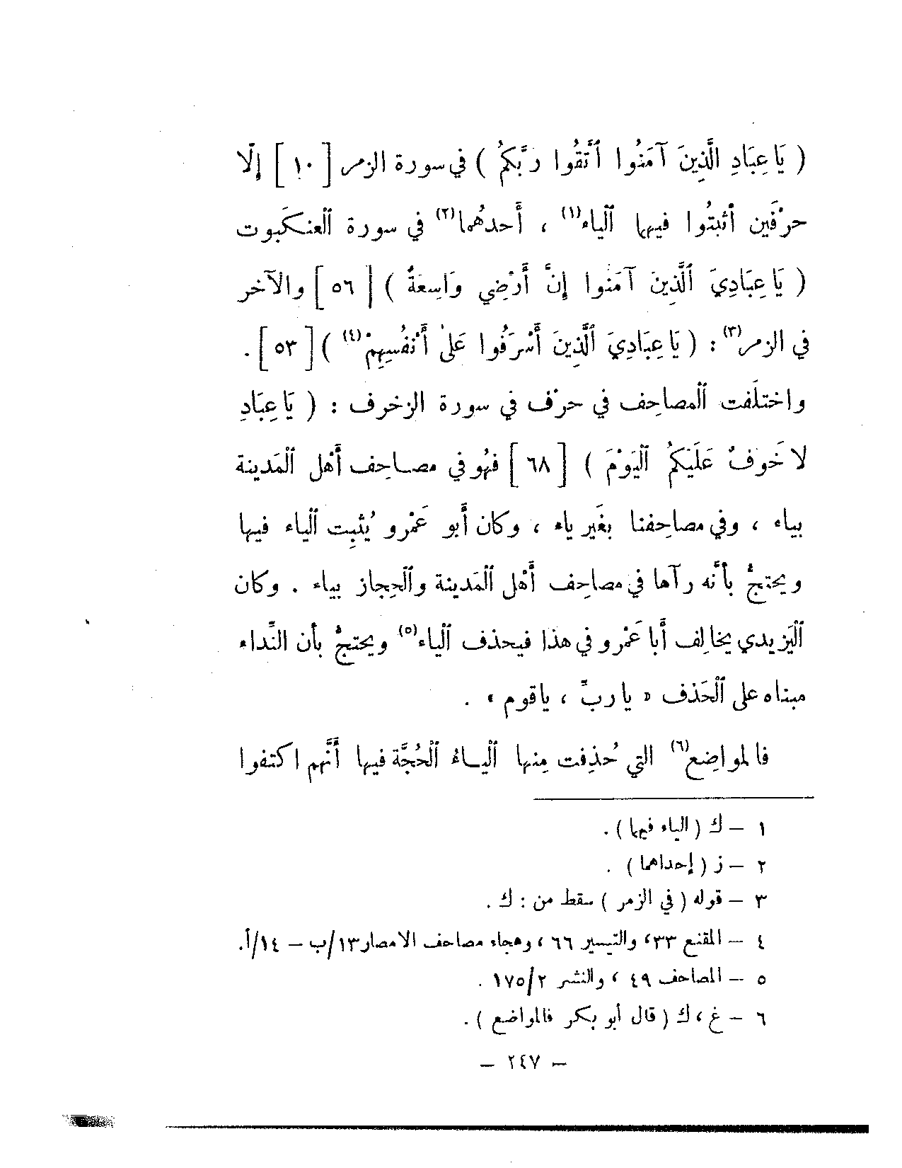 واختلف المصاحف في حرف في سورة الزخرف: {يا عباد لا خوف عليكم اليوم} [68] فهو في مصاحف أهل المدينة بياء، وفي مصاحفنا بغير ياء، وكان أبو عمرو يثبت الياء فيها ويحتج بأنه رآها في مصاحف أهل المدينة والحجاز بياء. وكان اليزيدي يخالف أبا عمرو في هذا فيحذف الياء ويحتج بأن النداء مبناه على الحذف «يا رب، يا قوم».