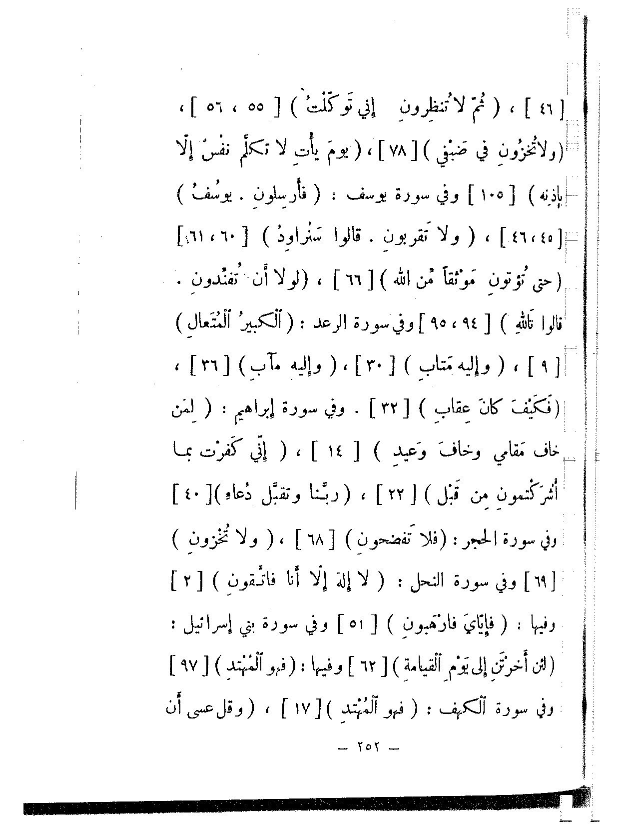 [46]، {ثم لا تنظرون إني توكلت} [55، 56]، {ولا تخزون في ضيفي} [78]، {يوم يأت لا تكلم نفس إلا بإذنه} [105] وفي سورة يوسف: {فأرسلون. يوسف} [45، 46]، {ولا تقربون. قالوا سنراود} [60، 61] {حتى تؤتون موثقا من الله} [66]، {لولا أن تفندون. قالوا تالله} [94، 95] وفي سورة الرعد: {الكبير المتعال} [0]، {وإليه متاب} [30]، {وإليه مآب} [36]، {فكيف كان عقاب} [32]. وفي سورة إبراهيم: {لمن خاف مقامي وخاف وعيد} [14]، {إني كفرت بما أشركتمون من قبل} [22]، {ربنا وتقبل دعاء} [40] وفي سورة الحجر: {فلا تفضحون} [68]، {ولا تخزون} [69] وفي سور النحل: {لا إله إلا أنا فاتقون} [2] وفيها: {فإياي فارهبون} [51] وفي سورة بني إسرائيل: {لئن أخرتن إلى يوم القيامة} [62] وفيها: {فهو المهتد} [97] وفي سورة الكهف: {فهو المهتد} [17]، {وقل عسى أن