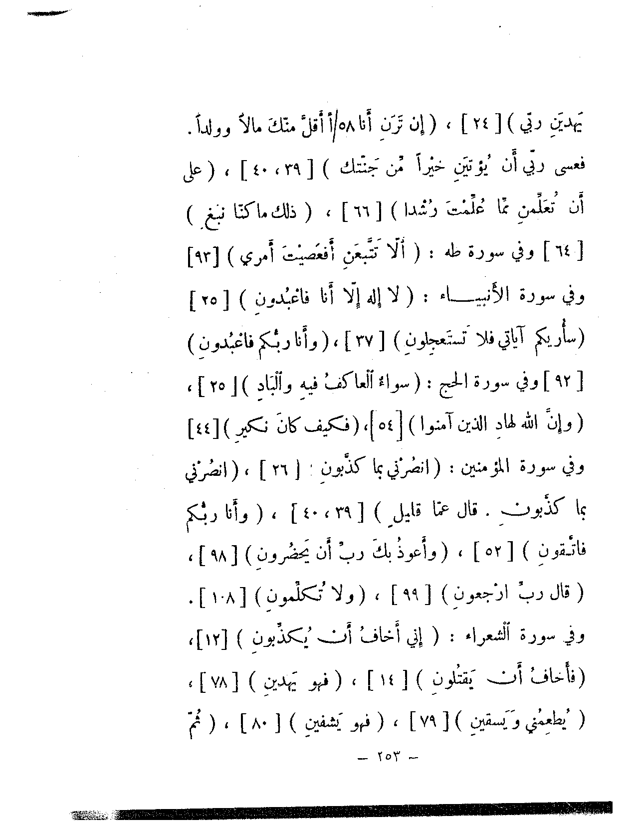 يهدين ربي} [24]، {إن ترن أنا أقل منك مالا وولدا. فعسى ربي أن يؤتين خيرا من جنتك} [39، 40]، {على أن تعلمن مما علمت رشدا} [66]، {ذلك ما كنا نبغ} [64]. وفي سورة طه: {ألا تتبعن أفعصيت أمري} [93] وفي سورة الأنبياءك {لا إله إلا أنا فاعبدون} [25] {سأريكم آياتي فلا تستعجلون} [37]، {وأنا ربكم فاعبدون} [92] وفي سورة الحج: {سواء العاكف فيه والباد} [25]، {وإن الله لهاد الذين آمنوا} [54]، {فكيف كان نكير} [44] وفي سورة المؤمنين: {انصرني بما كذبون} [26]، {انصرني بما كذبون. قال عما قليل} [39، 40]، {وأنا ربكم فاتقون} [52]، {وأعوذ بك رب أن يحضرون} [98]، {قال رب ارجعون} [99]، {ولا تكلمون} [108]. وفي سورة الشعراء: {إني أخاف أن يذكبون} [12]، {فأخاف أن يقتلون} [14]، {فهو يهدين} [78]، {يطعمني ويسقين} [79]، {فهو يشفين} [80]، {ثم