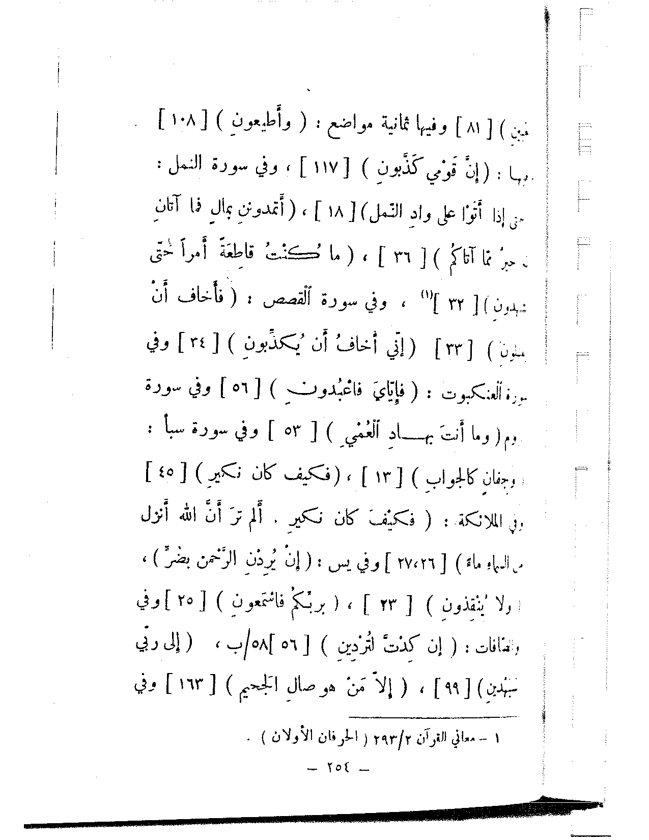 مبين} [81] وفيها ثمانية مواضع: {وأطيعون} [108] وفيها: {إن قومي كذبون} [117]، وفي سورة النمل: {حتى إذا أتوا على واد النمل} [18]، {أتمدونن بمال فما آتان له خير مما أتاكم} [36]، {ما كنت قاطعة أمرًا حتى تهدون} [32]، وفي سورة القصص: {فأخاف أن يقتلون} [33] {إني أخاف أن يكذبون} [34] وفي سورة العنكبوت: {فإياي فاعبدون} [56] وفي سورة الروم {وما أنت بهاد العمي} [53] وفي سورة سبأ: {وجفان كالجواب} [13]، {فكيف كان نكير} [45]، وفي الملائكة: {فكيف كان نكير. ألم تر أن الله أنزل من السماء ماء} [26، 27] وفي يس: {إن يردن الرحمن بضر، ولا ينقذون} [23]، {بربكم فاسمعون} [25] وفي الصافات: {إن دكت لتردين} [56]، {إلى ربي سيهدين} [99]، {إلا من هو صال الجحيم} [163] وفي