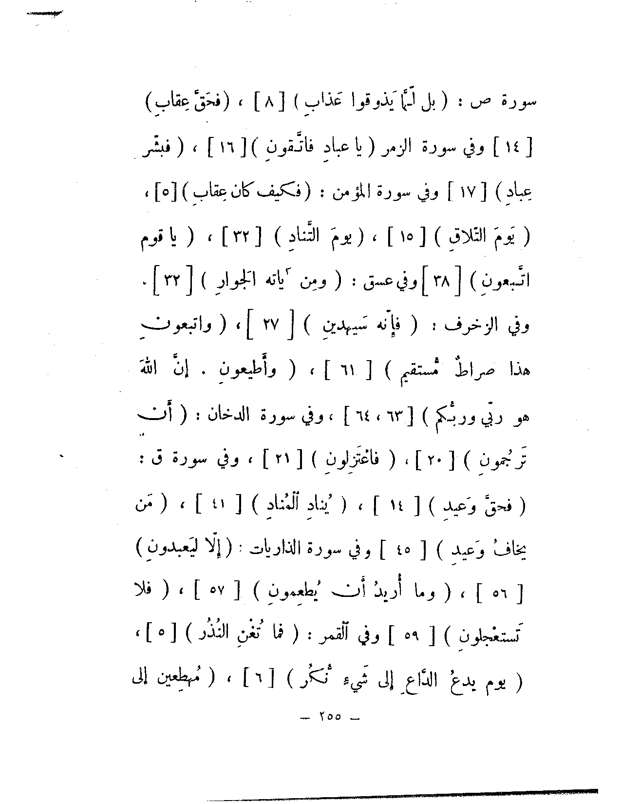 سورة ص: {بل لما يذوقوا عذاب} [8]، {فحق عقاب} [14] وفي سورة الزمر {يا عباد فاتقون} [16]، {فبشر عباد} [17] وفي سورة المؤمن: {فكيف كان عقاب} [5]، {يوم التلاق} [15]، {يوم التناد} [32]، {يا قوم اتبعون} [38] وفي عسق: {ومن آياته الجوار} [32]، وفي الزخرف: {فإنه سيهدين} [27]، {واتبعون هذا صراط مستقيم} [61]، {وأطيعون. إن الله هو ربي وربكم} [63، 64]، وفي سورة الدخان: {أن ترجمون} [20]، {فاعتزلون} [21]، وفي سورة ق: {فحق وعيد} [14]، {يناد المناد} [41]، {من يخاف وعيد} [45]، وفي سورة الذاريات: {إلا ليعبدون} [56]، {وما أريد أن يطعمون} [57]، {فلا تستعجلون} [59] وفي القمر: {فما تغن النذر} [5]، {يوم يدع الداع إلى شيء نكر} [6]، {مهطعين إلى