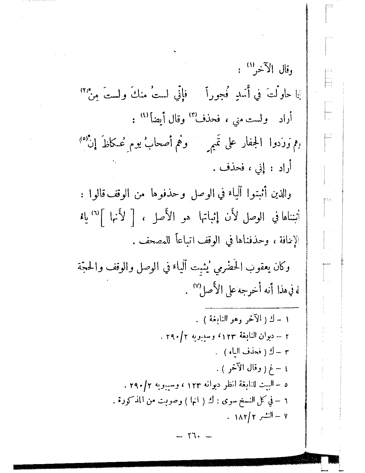 وكان يعقوب الحضرمي يثبت الياء في الوصل والوقف والحجة له في هذا أنه أخرجه على الأصل.