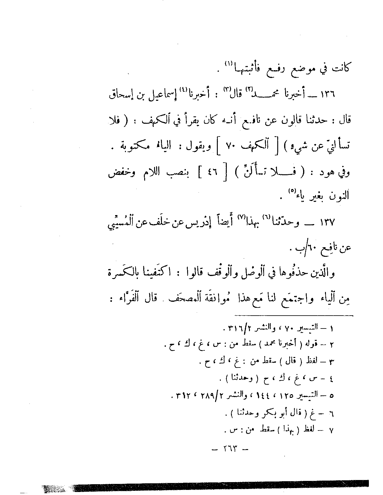 136 - أخبرنا محمد قال: أخبرنا إسماعيل بن إسحاق قال: حدثنا قالون عن نافع أنه كان يقرأ في الكهف: {فلا تسألني عن شيء} [الكفه: 70] ويقول: الياء مكتوبة. وفي هود: {فلا تسألن} [46 ي بنصب اللام وخفض النون بغير ياء.