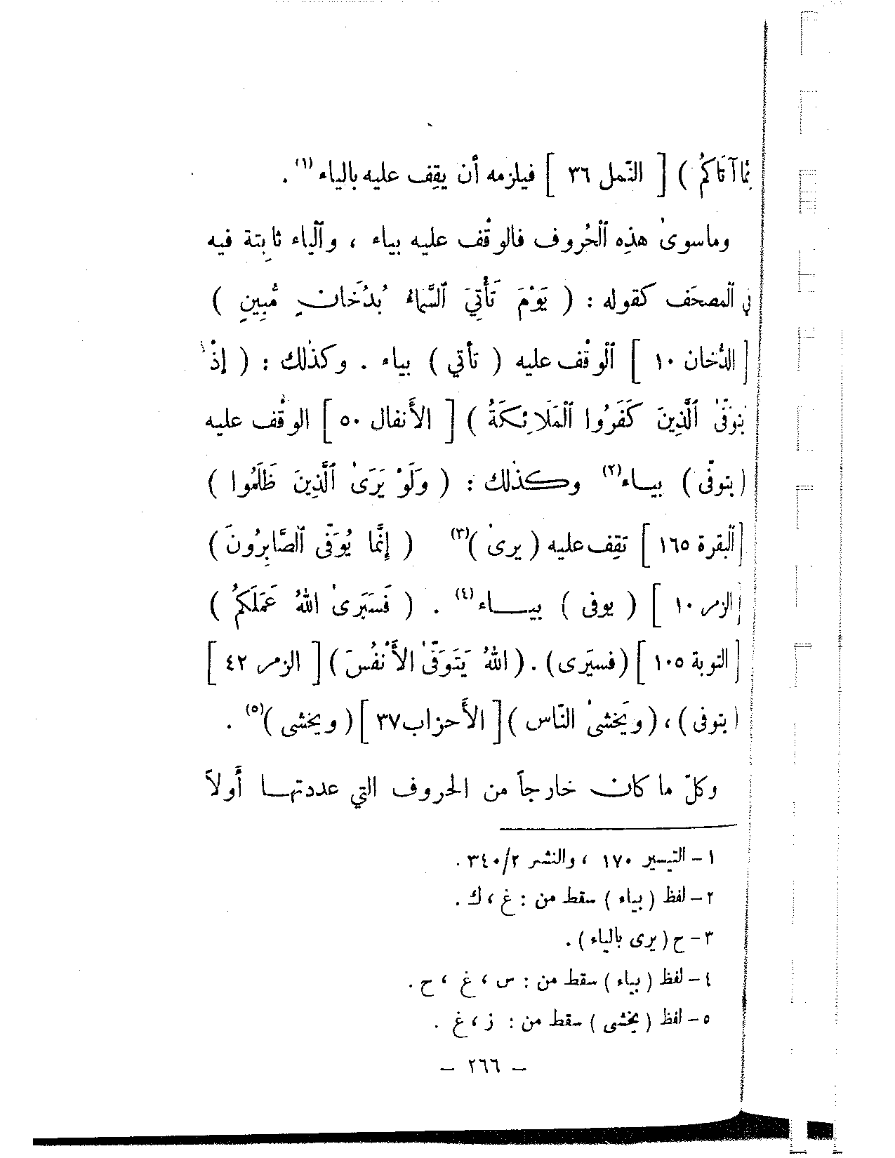 وما سوى هذه الحروف فالوقف عليه بياء، والياء ثابتة فيه في المصحف كقوله: {يوم تأتي السماء بدخان مبين} [الدخان: 10] الوقف عليه (تأتي) بياء. وكذلك: {إذ يتوفى الذين كفروا الملائكة} [الأنفال: 50] الوقف عليه (يتوفى) بياء وكذلك: {ولو يرى الذين ظلموا} [البقرة: 165] تقف عليه (يرى) {إنما يوفى الصابرون} [الزمر: 10] (يوفى) بياء. {فسيرى الله عملكم} [التوبة: 105] (فسيرى). {الله يتوفى الأنفس} [الزمر: 42] (يتوفى)، {ويخشى الناس} [الأحزاب: 37] (ويخشى).