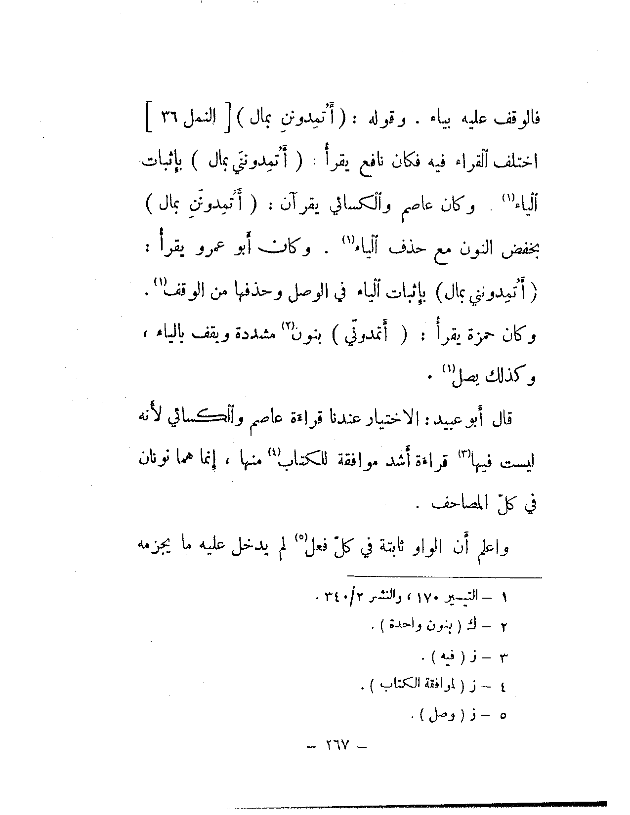فالوقف عليه بياء. وقوله: {أتمدونن بمال} [النمل: 36] اختلف القراء فيه فكان نافع يقرأ: (أتمدونني بمال) بإثبات الياء. وكان عاصم والكسائي يقرآن: (أتمدونن بمال) بخفض النون مع حذف الياء. وكان أبو عمرو يقرأ (أتمدونني بمال) بإثبات الياء في الوصل وحذفها من الوقف. وكان حمزة يقرأ: (أتمدوني) بنون مشددة ويقف بالياء، وكذلك يصل.