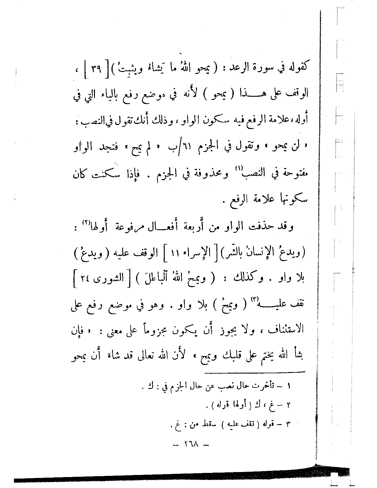 كقوله في سورة الرعد: {يمحو الله ما يشاء وثبت} [39]، الوقف على هذا (يمحو) لأنه في موضع رفع بالياء التي في أوله، علامة الرفع فيه سكون الواو، وذلك أنك تقول في النصب: «لن يمحو» وتقول في الجزم «لم يمح» فتجد الواو مفتوحة في النصب ومحذوفة في الجزم. فإذا سكنت كان سكونها علامة الرفع.