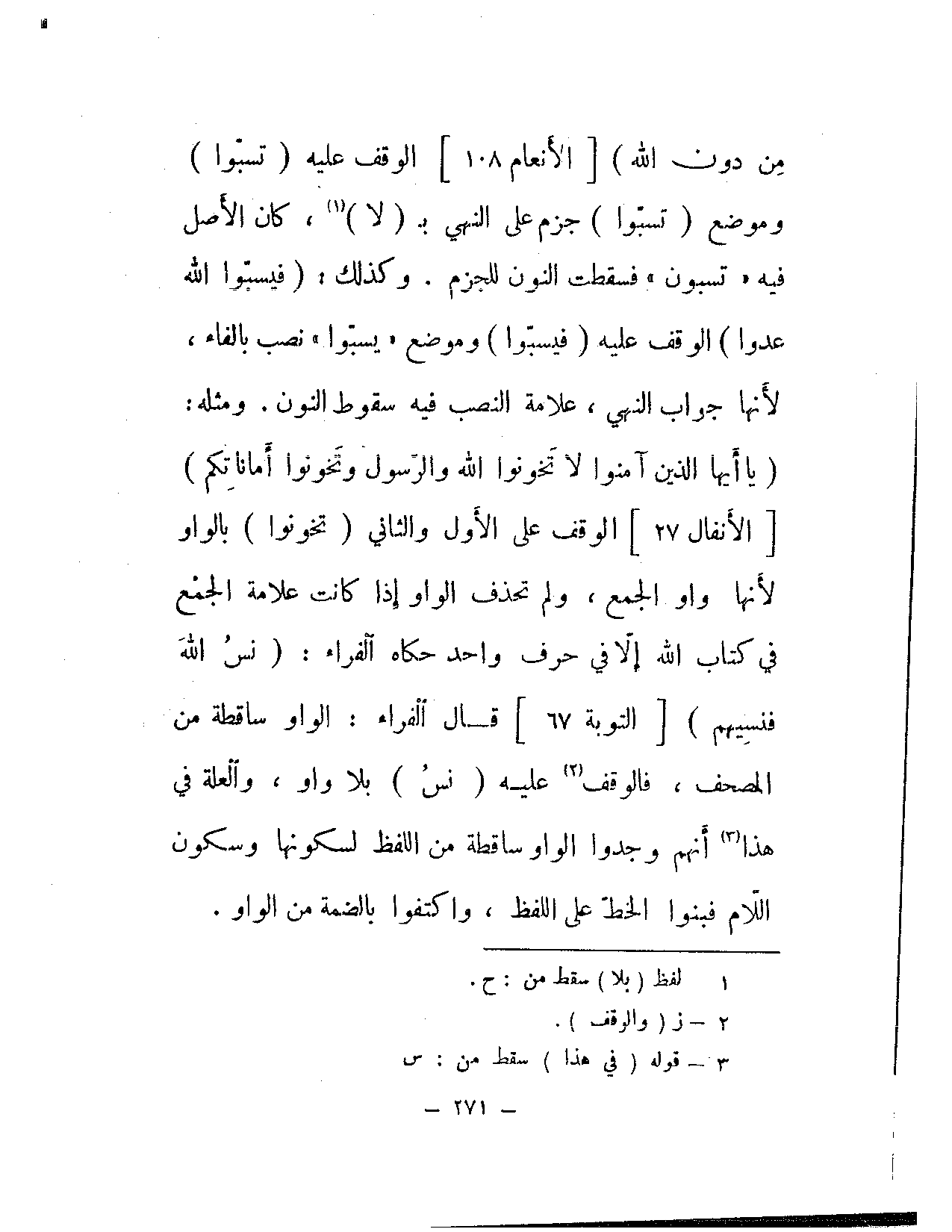 من دون الله} [الأنعام: 108] الوقف عليه (تسبوا) وموضع (تسبوا) جزم على النهي بـ (لا)، كان الأصل فيه «تسبون» فسقطت النون للجزم. وكذلك: (فيسبوا الله عدوا) الوقف عليه (فيسبوا) وموضع «يسبوا» نصب بالفاء، لأنها جواب النهي، علامة النصب فيه سقوط النون. ومثله: {يا أيها الذين آمنوا لا تخونوا الله والرسول وتخونوا أماناتكم} [الأنفال: 27] الوقف على الأول والثاني (تخونوا) بالواو لأنها واو الجمع، ولم تحذف الواو إذا كانت علامة الجمع في كتاب الله إلا في حرف واحد حكاه الفراء: {نس الله فنسيهم} [التوبة: 67] قال الفراء: الواو ساقطة من المصحف، فالوقف عليه (نس) بلا واو، والعلة في هذا أنهم وجدوا الواو ساقطة من اللفظ لسكونها وسكون اللام فبنوا الخط على اللفظ، واكتفوا بالضمة من الواو.
